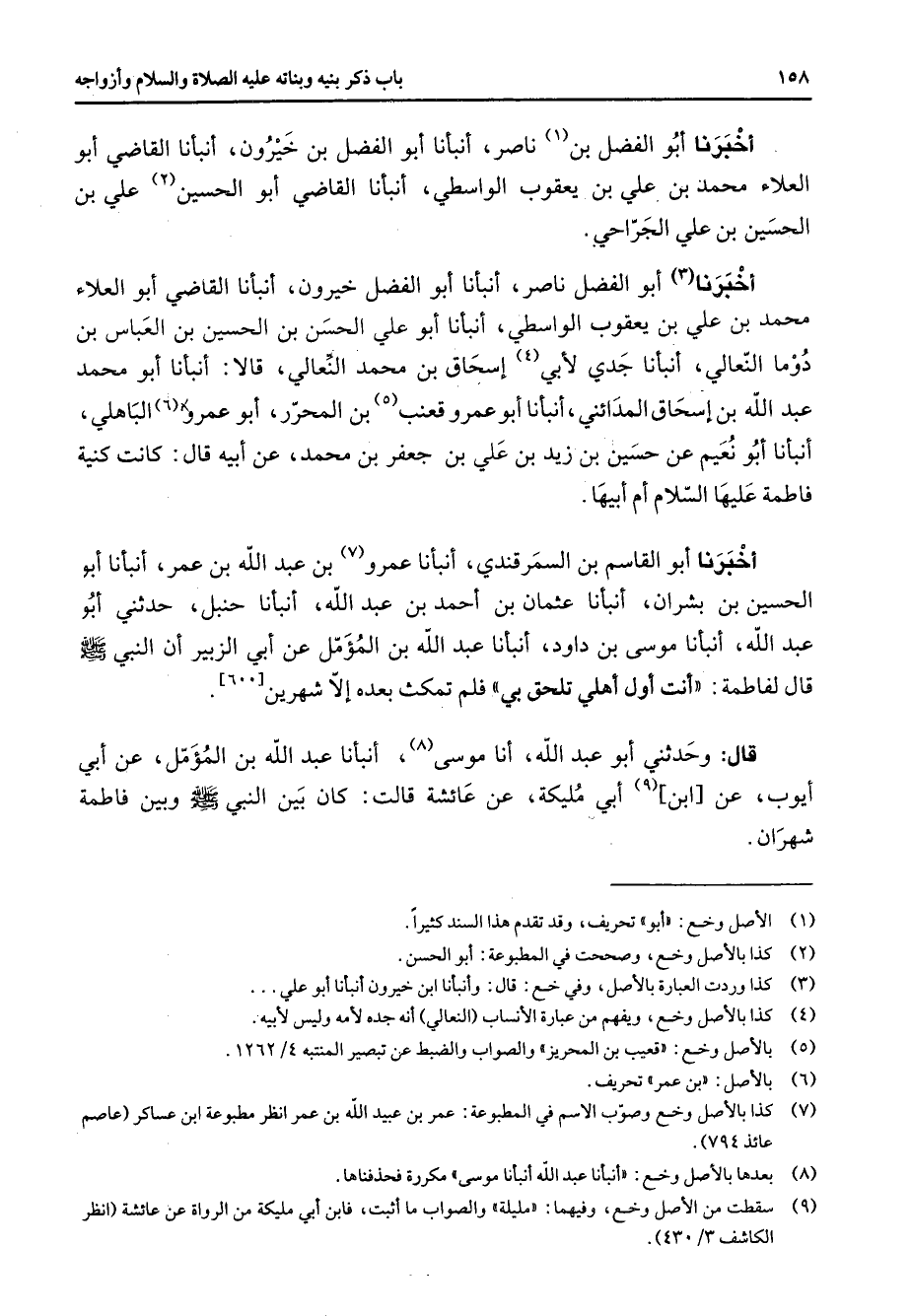 أخبرنا أبو الفضل بن (1) ناصر أنبأنا أبو الفضل بن خيرون أنبأنا القاضي أبو العلاء محمد بن علي بن يعقوب الواسطي أنبأنا القاضي أبو الحسين (2) علي بن الحسين بن علي الجراحي أخبرنا (3) أبو الفضل ناصر أنبأنا أبو الفضل خيرون أنبأنا القاضي أبو العلاء محمد بن علي بن يعقوب الواسطي أنبأنا أبو علي الحسن بن الحسين بن العباس بن دوما النعالي أنبأنا جدي لأبي (4) إسحاق بن محمد النعالي قالا أنبأنا أبو محمد عبد الله بن إسحاق المدائني أنبأنا أبو عمرو قعنب (5) بن المحرر أبو عمرو (6) الباهلي أنبأنا أبو نعيم عن حسين بن زيد بن علي بن جعفر بن محمد عن أبيه قال كانت كنية فاطمة عليها السلام أم أبيها أخبرنا أبو القاسم بن السمرقندي أنبأنا عمرو (7) بن عبد الله بن عمر أنبأنا أبو الحسين بن بشران أنبأنا عثمان بن أحمد بن عبد الله أنبأنا حنبل حدثني أبو عبد الله أنبأنا موسى بن داود أنبأنا عبد الله بن المؤمل عن أبي الزبير أن النبي (صلى الله عليه وسلم) قال لفاطمة أنت أول أهلي تلحق بي فلم تمكث بعده إلا شهرين