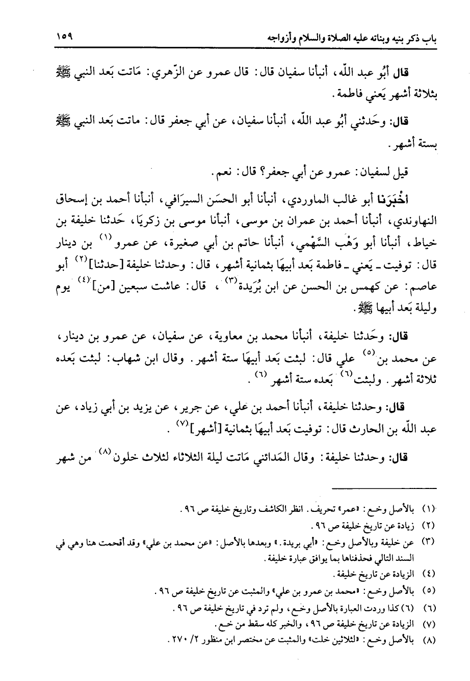 قال أبو عبد الله أنبأنا سفيان قال قال عمرو عن الزهري ماتت بعد النبي (صلى الله عليه وسلم) بثلاثة أشهر يعني فاطمة قال وحدثني أبو عبد الله أنبأنا سفيان عن أبي جعفر قال ماتت بعد النبي (صلى الله عليه وسلم) بستة أشهر قيل لسفيان عمرو عن أبي جعفر قال نعم أخبرنا أبو غالب الماوردي أنبأنا أبو الحسن السيرافي أنبأنا أحمد بن إسحاق النهاوندي أنبأنا أحمد بن عمران بن موسى أنبأنا موسى بن زكريا حدثنا خليفة بن خياط أنبأنا أبو وهب السهمي أنبأنا حاتم بن أبي صغيرة عن عمرو (1) بن دينار قال توفيت يعني فاطمة بعد أبيها بثمانية أشهر قال وحدثنا حليفة حدثنا (2) أبو عاصم عن كهمس بن الحسن عن ابن بريدة (3) قال عاشت سبعين من (4) يوم وليلة بعد أبيها (صلى الله عليه وسلم) قال وحدثنا خليفة أنبأنا محمد بن معاوية عن سفيان عن عمرو بن دينار عن محمد بن (5) علي قال لبثت بعد أبيها ستة اشهر وقال ابن شهاب لبثت بعده ثلاثة أشهر ولبثت (6) بعده ستة أشهر (6) قال وحدثنا خليفة أنبأنا أحمد بن علي عن جرير عن يزيد بن أبي زياد عن عبد الله بن الحارث قال توفيت بعد أبيها بثمانية أشهر (7) قال وحدثنا خليفة وقال المدائني ماتت ليلة الثلاثاء لثلاث خلون (8) من شهر