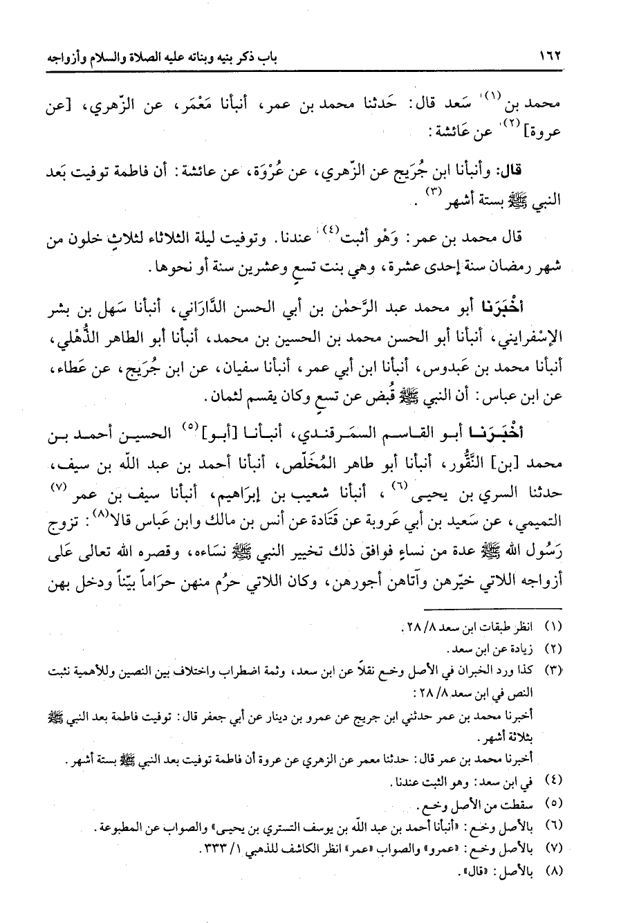محمد بن (1) سعد قال حدثنا محمد بن عمر أنبأنا معمر عن الزهري عن عروة (2) عن عائشة قال وأنبأنا ابن جريج عن الزهري عن عروة عن عائشة أن فاطمة توفيت بعد النبي (صلى الله عليه وسلم) بستة أشهر (3) قال محمد بن عمر وهو أثبت (4) عندنا وتوفيت ليلة الثلاثاء لثلاث خلون من شهر رمضان سنة إحدى عشرة وهي بنت تسع وعشرين سنة أو نحوها أخبرنا أبو محمد عبد الرحمن بن أبي الحسن الداراني أنبأنا سهل بن بشر الإسفرايني أنبأنا أبو الحسن محمد بن الحسين بن محمد أنبأنا أبو الطاهر الذهلي أنبأنا محمد بن عبدوس أنبأنا ابن أبي عمر أنبأنا سفيان عن ابن جريج عن عطاء عن ابن عباس أن النبي (صلى الله عليه وسلم) قبض عن تسع وكان يقسم لثمان أخبرنا أبو القاسم السمرقندي أنبأنا أبو (5) الحسين أحمد بن محمد بن النقور أنبأنا أبو طاهر المخلص أنبأنا أحمد بن عبد الله بن سيف حدثنا السري بن يحيى (6) أنبأنا شعيب بن إبراهيم أنبأنا سيف بن عمر (7) التميمي عن سعيد بن أبي عروبة عن قتادة عن أنس بن مالك وابن عباس قالا (8) تزوج رسول الله (صلى الله عليه وسلم) عدة من نساء فوافق ذلك تخيير النبي (صلى الله عليه وسلم) نساءه وقصره الله تعالى على أزواجه اللاتي خيرهن وآتاهن أجورهن وكان اللاتي حرم منهن حراما بينا ودخل بهن