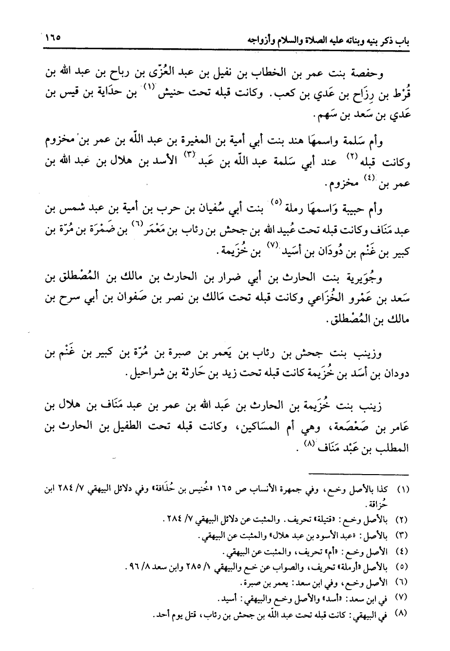 وحفصة بنت عمر بن الخطاب بن نفيل بن عبد العزى بن رباح بن عبد الله بن قرط بن رزاح بن عدي بن كعب وكانت قبله تحت حنيش (1) بن حداية بن قيس بن عدي بن سعد بن سهم وأم سلمة واسمها هند بنت أبي أمية بن المغيرة بن عبد الله بن عمر بن مخزوم وكانت قبله (2) عند ابي سلمة عبد الله بن عبد (3) الأسد بن هلال بن عبد الله بن عمر بن (4) مخزوم وأم حبيبة واسمها رملة (5) بنت أبي سفيان بن حرب بن أمية بن عبد شمس بن عبد مناف وكانت قبله تحت عبيد الله بن جحش بن رئاب بن معمر (6) بن ضمرة بن مرة بن كبير بن غنم بن دودان بن أسيد (7) بن خزيمة وجويرية بنت الحارث بن أبي ضرار بن الحارث بن مالك بن المصطلق بن سعد بن عمرو الخزاعي وكانت قبله تحت مالك بن نصر بن صفوان بن أبي سرح بن مالك بن المصطلق وزينب بنت جحش بن رئاب بن يعمر بن صبرة بن مرة بن كبير بن غنم بن دودان بن أسد بن خزيمة كانت قبله تحت زيد بن حارثة بن شراحيل زينب بنت خزيمة بن الحارث بن عبد الله بن عمر بن عبد مناف بن هلال بن عامر بن صعصعة وهي أم المساكين وكانت قبله تحت الطفيل بن الحارث بن المطلب بن عبد مناف (8)