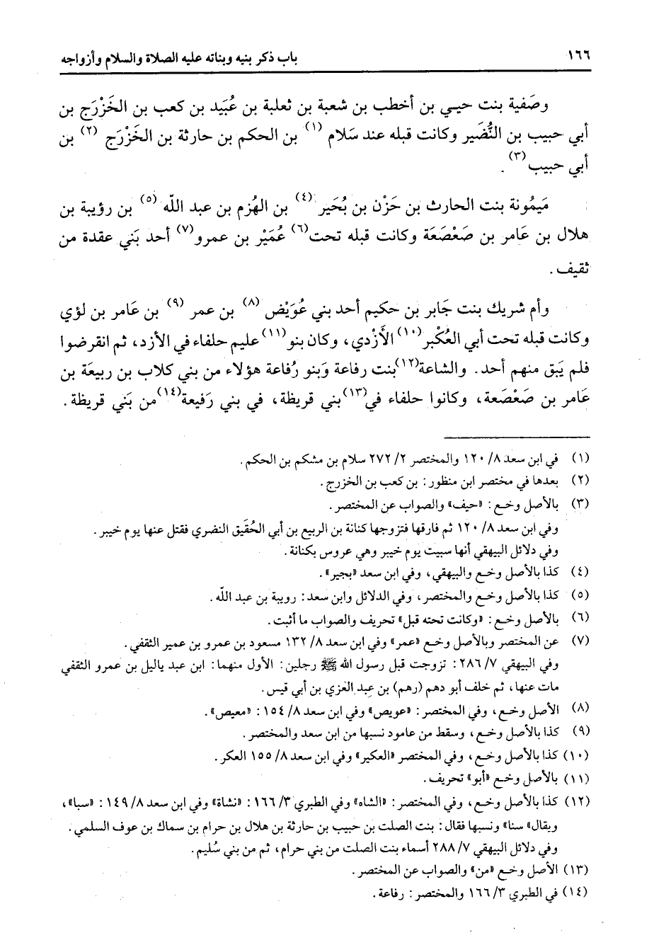 وصفية بنت حيي بن أخطب بن شعبة بن ثعلبة بن عبيد بن كعب بن الخزرج بن أبي حبيب بن النضير وكانت قبله عند سلام (1) بن الحكم بن حارثة بن الخزرج (2) بن أبي حبيب (3) ميمونة بنت الحارث بن حزن بن بحير (4) بن الهزم بن عبد الله (5) بن رؤيبة بن هلال بن عامر بن صعصعة وكانت قبله تحت (6) عمير بن عمرو (7) أحد بني عقدة من ثقيف وأم شريك بنت جابر بن حكيم أحد بني عويض (8) بن عمر بن عامر (9) بن لؤي وكانت قبله تحت أبي العكبر (10) الأزدي وكان بنو (11) عليم حلفاء في الأزد ثم انقرضوا فلم يبق منهم أحد والشاعة (12) بنت رفاعة وبنو رفاعة هؤلاء من بني كلاب بن ربيعة بن عامر بن صعصعة وكانوا حلفاء في (13) بني قريظة في بني رفيعة من بني قريظة