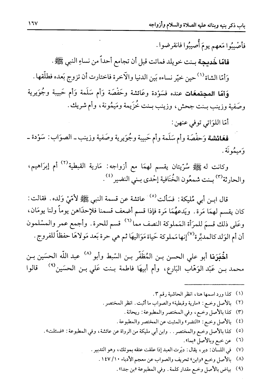 فأصيبوا معهم يوم أصيبوا فانقرضوا فأما خديجة بنت خويلد فماتت قبل أن تجامع أحدا من نساء النبي (صلى الله عليه وسلم) وأما الشاة (1) حين خير نساءه بين الدنيا والآخرة فاختارت أن تزوج بعده فطلقها وأما المجتمعات عنده فسودة وعائشة وحفصة وأم سلمة وأم حبيبة وجويرية وصفية وزينب بنت جحش وزينب بنت خزيمة وميمونة وأم شريك أما اللواتي توفي عنهن فعائشة وحفصة وأم سلمة وأم حبيبة وجويرية وصفية وزينب الصواب سودة وميمونة وكانت له (صلى الله عليه وسلم) سريتان يقسم لهما مع أزواجه مارية القبطية (2) أم إبراهيم والحارثة (3) بنت شمعون الخنافية إحدى بني النضير (4) قال ابن أبي مليكة فسألت (5) عائشة عن قسمة النبي (صلى الله عليه وسلم) لأمي ولده فقالت كان يقسم لهما مرة ويدعهما مرة فإذا قسم أضعف قسمنا فلإحداهن يوما ولنا يومان وعلى ذلك قسم للمرأة المملوكة النصف مما (6) قسم للحرة وأجمع عمر والمسلمون أن أم الولد كالمدبرة (7) إنها مملوكة حياة مواليها ثم هي حرة بعد مولاها حفظا للفروج أخبرنا أبو علي الحسن بن المظفر بن السبط وأبو (8) عبد الله الحسين بن محمد بن عبد الوهاب البارع وأم أبيها فاطمة بنت علي بن الحسين (9) قالوا
