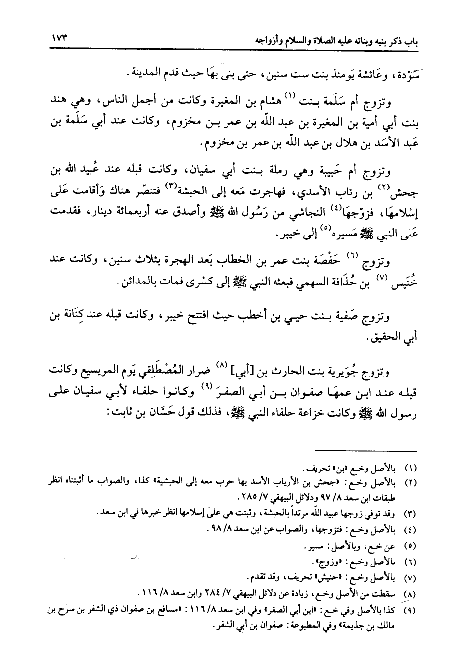 سودة وعائشة يومئذ بنت ست سنين حتى بنى بها حيث قدم المدينة وتزوج أم سلمة بنت (1) هشام بن المغيرة وكانت من أجمل الناس وهي هند بنت أبي أمية بن المغيرة بن عبد الله بن عمر بن مخزوم وكانت عند أبي سلمة بن عبد الأسد بن هلال بن عبد الله بن عمر بن مخزوم وتزوج أم حبيبة وهي رملة بنت أبي سفيان وكانت قبله عند عبيد الله بن جحش (2) بن رئاب الأسدي فهاجرت معه إلى الحبشة (3) فتنصر هناك وأقامت على إسلامها فزوجها (4) النجاشي من رسول الله (صلى الله عليه وسلم) وأصدق عنه أربعمائة دينار فقدمت على النبي (صلى الله عليه وسلم) مسيره (5) إلى خيبر وتزوج (6) حفصة بنت عمر بن الخطاب بعد الهجرة بثلاث سنين وكانت عند خنيس (7) بن حذافة السهمي فبعثه النبي (صلى الله عليه وسلم) إلى كسرى فمات بالمدائن وتزوج صفية بنت حيي بن أخطب حيث افتتح خيبر وكانت قبله عند كنانة بن أبي الحقيق وتزوج جويرية بنت الحارث بن أبي (8) ضرار المصطلقي يوم المريسيع وكانت قبله عند ابن عمها صفوان بن أبي الصفر (9) وكانوا حلفاء لأبي سفيان على رسول الله (صلى الله عليه وسلم) وكانت خزاعة حلفاء النبي (صلى الله عليه وسلم) فذلك قول حسان بن ثابت