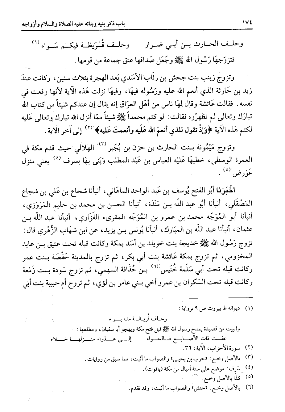 وحلف الحارث بن أبي ضرار * وحلف قريظة فيكم سواء (1) * فتزوجها رسول الله (صلى الله عليه وسلم) وجعل صداقها عتق جماعة من قومها وتزوج زينب بنت جحش بن رئاب الأسدي بعد الهجرة بثلاث سنين وكانت عند زيد بن حارثة الذي أنعم الله عليه ورسوله فيها وفيها نزلت هذه الآية لأنها وقعت في نفسه فقالت عائشة وقال لها ناس من أهل العراق إنه يقال إن عندكم شيئا من كتاب الله تبارك وتعالى لم تظهروه فقالت لو كتم محمدا (صلى الله عليه وسلم) شيئا مما أنزل الله تبارك وتعالى عليه لكتم هذه الآية " وإذا تقول للذي أنعم الله عليه وأنعمت عليه " (2) إلى آخر الآية وتزوج ميمونة بنت الحارث بن حزن بن بخير (3) الهلالي حيث قدم مكة في العمرة الوسطى خطبها عليه العباس بن عبد المطلب وبنى بها بسرف (4) يعني منزل عورض (5) أخبرنا أبو الفتح يوسف بن عبد الواحد الماهاني أنبأنا شجاع بن علي بن شجاع المصقلي أنبأنا أبو عبد الله بن مندة أنبأنا الحسن بن محمد بن حليم المروزي أنبأنا أبو الموجه محمد بن عمرو بن الموجه المقرئ الفزاري أنبأنا عبد الله بن عثمان أنبأنا عبد الله بن المبارك أنبأنا يونس بن يزيد عن ابن شهاب الزهري قال تزوج رسول الله (صلى الله عليه وسلم) خديجة بنت خويلد بن أسد بمكة وكانت قبله تحت عتيق بن عابد المخزومي ثم تزوج بمكة عائشة بنت أبي بكر ثم تزوج بالمدينة حفصة بنت عمر وكانت قبله تحت أبي سلمة خنيس (6) بن حذافة السهمي ثم تزوج سودة بنت زمعة وكانت قبله تحت السكران بن عمرو أخي بني عامر بن لؤي ثم تزوج أم حبيبة بنت أبي