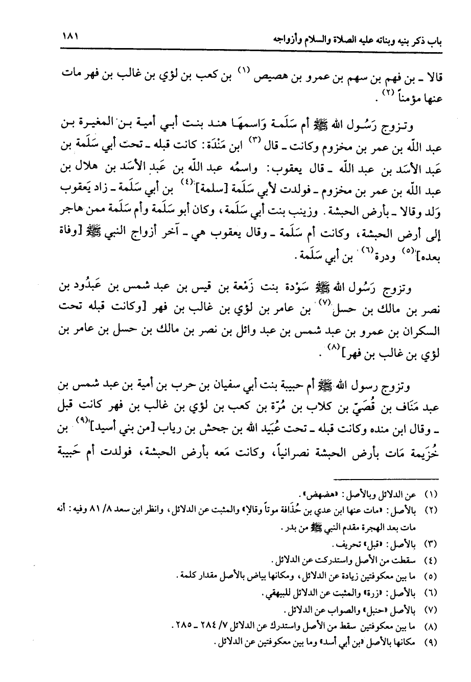قالا بن فهم بن سهم بن عمرو بن هصيص (1) بن كعب بن لؤي بن غالب بن فهمات عنها مؤمنا (2) وتزوج رسول الله (صلى الله عليه وسلم) أم سلمة واسمها هند بنت أبي أمية بن المغيرة بن عبد الله بن عمر بن مخزوم وكانت قال (3) ابن مندة كانت قبله تحت أبي سلمة بن عبد الأسد بن عبد الله قال يعقوب واسمه عبد الله بن عبد الأسد بن هلال بن عبد الله بن عمر بن مخزوم فولدت لأبي سلمة سلمة (4) بن أبي سلمة زاد يعقوب ولد وقالا بأرض الحبشة وزينب بنت أبي سلمة وكان أبو سلمة وأم سلمة ممن هاجر إلى أرض الحبشة وكانت أم سلمة وقال يعقوب هي آخر أزواج النبي (صلى الله عليه وسلم) وفاة بعده (5) ودرة (6) بن أبي سلمة وتزوج رسول الله (صلى الله عليه وسلم) سودة بنت زمعة بن قيس بن عبد شمس بن عبدود بن نصر بن مالك بن حسل (7) بن عامر بن لؤي بن غالب بن فهر وكانت قبله تحت السكران بن عمرو بن عبد شمس بن عبد وائل بن نصر بن مالك بن حسل بن عامر بن لؤي بن غالب بن فهر (8) وتزوج رسول الله (صلى الله عليه وسلم) أم حبيبة بنت أبي سفيان بن حرب بن أمية بن عبد شمس بن عبد مناف بن قصي بن كلاب بن مرة بن كعب بن لؤي بن غالب بن فهر كانت قبل وقال ابن منده وكانت قبله تحت عبيد الله بن جحش بن رياب من بني أسيد (9) بن خزيمة مات بأرض الحبشة نصرانيا وكانت معه بأرض الحبشة فولدت أم حبيبة