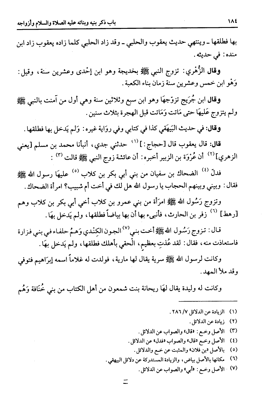 بها فطلقها وينتهي حديث يعقوب والحلبي وقد زاد الحلبي كلما زاده يعقوب زاد ابن منده في حديثه وقال الزهري تزوج النبي (صلى الله عليه وسلم) بخديجة وهو ابن إحدى وعشرين سنة وقيل وهو ابن خمس وعشرين سنة زمان بناء الكعبة وقال ابن جريج تزوجها وهو ابن سبع وثلاثين سنة وهي أول من آمنت بالنبي (صلى الله عليه وسلم) ولم يتزوج عليها حتى ماتت وماتت قبل الهجرة بثلاث سنين وقال في حديث البيهقي كذا في كتابي وفي رواية غيره ولم يدخل بها فطلقها قال قال يعقوب قال حجاج (1) حدثني جدي أنبأنا محمد بن مسلم يعني الزهري (2) أن عروة بن الزبير أخبره أن عائشة زوج النبي (صلى الله عليه وسلم) قالت (3) فدل (4) الضحاك بن سفيان من بني أبي بكر بن كلاب (5) عليها رسول الله (صلى الله عليه وسلم) فقال وبيني وبينهم الحجاب يا رسول الله هل لك في أخت أم شبيب امرأة الضحاك وتزوج رسول الله (صلى الله عليه وسلم) امرأة من بني عمرو بن كلاب أخي أبي بكر بن كلاب وهم رهط زفر بن الحارث فأنبئ بها أن بها بياضا فطلقها ولم يدخل بها قال تزوج رسول الله (صلى الله عليه وسلم) أخت بني الجون الكندي وهم حلفاء في بني فزارة فاستعاذت منه فقال لقد عذت بعظيم الحقي بأهلك فطلقها ولم يدخل بها وكانت لرسول الله (صلى الله عليه وسلم) سرية يقال لها مارية فولدت له غلاما اسمه إبراهيم فتوفي وقد ملأ المهد وكانت له وليدة يقال لها ريحانة بنت شمعون من أهل الكتاب من بني خنافة وهم