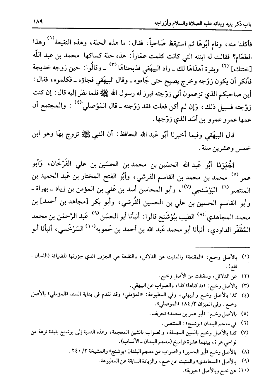 فأكلنا منه ونام أبوها ثم استيقظ صاحيا فقال ما هذه الحلة وهذه النقيعة (1) وهذا الطعام فقالت له ابنته التي كانت كلمت عمارا هذه حلة كساكها محمد بن عبد الله ختنك (2) وبقرة أهداها لك زاد البيهقي فذبحناها (3) وقالوا حين زوجه خديجة فأنكر أن يكون زوجه وخرج يصيح حتى جاءوه وقال البيهقي فجاؤه فكلموه فقال أين صاحبكم الذي تزعمون أني زوجته فبرز له رسول الله (صلى الله عليه وسلم) فلما نظر إليه قال إن كنت زوجته فسبيل ذلك وإن لم أكن فعلت فقد زوجته قال الموصلي (4) والمجتمع أن عمها عمرو عمرو بن أسد الذي زوجها قال البيهقي وفيما أخبرنا أبو عبد الله الحافظ أن النبي (صلى الله عليه وسلم) تزوج بها وهو ابن خمس وعشرين سنة أخبرنا أبو عبد الله الحسين بن محمد بن الحسين بن علي الفرخان وأبو عمر (5) محمد بن محمد بن القاسم القرشي وأبو الفتح المختار بن عبد الحميد بن المنتصر (6) البوسنجي (7) وأبو المحاسن أسد بن علي بن المؤمن بن زياد بهراة وابو القاسم الحسين بن علي بن الحسين القرشي وأبو بكر مجاهد بن أحمد بن محمد المجاهدي (8) الطيب ببوشنج قالوا أنبأنا أبو الحسن (9) عبد الرحمن بن محمد المظفر الداودي أنبأنا أبو محمد عبد الله بن أحمد بن حمويه (10) السرخسي أنبأنا أبو