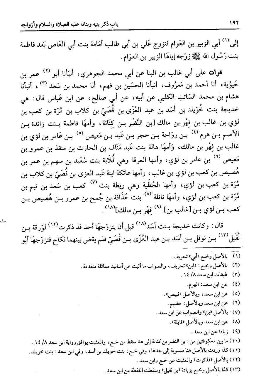 إلى (1) أبي الزبير بن العوام فتزوج علي بن أبي طالب أمامة بنت أبي العاص بعد فاطمة بنت رسول الله (صلى الله عليه وسلم) زوجه إياها الزبير بن العوام قرأت على أبي غالب بن البنا عن أبي محمد الجوهري أنبأنا أبو (2) عمر بن حيوية أنا أحمد بن معروف أنبأنا الحسين بن فهم أنا محمد بن سعد (3) أنبأنا هشام بن محمد السائب الكلبي عن أبيه عن أبي صالح عن ابن عباس قال هي خديجة بنت خويلد بن أسد بن عبد العزى بن قصي بن كلاب بن مرة بن كعب بن لؤي بن غالب بن فهر بن مالك بن النضر بن كنانة وأمها فاطمة بنت زائدة بن الأصم بن هرم (4) بن رواحة بن حجر بن عبد بن معيص (5) بن عامر بن لؤي بن غالب بن فهر بن مالك وأمها هالة بنت عبد مناف بن الحارث بن منقذ بن عمرو بن معيص (6) بن عامر بن لؤي وأمها العرقة وهي قلابة بنت سعيد بن سهم بن عمر بن هصيص بن كعب بن لؤي بن غالب وأمها عاتكة ابنة عبد العزى بن قصي بن كلاب بن مرة بن كعب بن لؤي وأمها الحظية وهي ريطة بنت (7) كعب بن سعد بن تيم بن مرة بن كعب بن لؤي وأمها نائلة (8) بنت حذافة بن جمح بن عمرو بن هصيص بن كعب بن لؤي بن غالب (9) بن فهر بن مالك (18) قال وكانت خديجة بنت أسد (18) قبل أن يتزوجها أحد قد ذكرت (12) لورقة بن نفيل (13) بن نوفل بن أسد بن عبد العزى بن قصي فلم يقض بينهما نكاح فتزوجها أبو