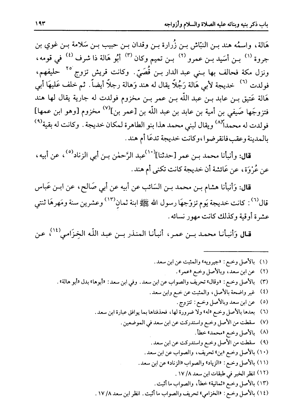 هالة واسمه هند بن النباش بن زرارة بن وقدان بن حبيب بن سلامة بن غوي بن جروة (1) بن أسيد بن عمرو (2) بن تميم وكان (3) أبو هالة ذا شرف (4) في قومه ونزل مكة فحالف بها بني عبد الدار بن قصي وكانت قريش تزوج (5) حليفهم فولدت (6) خديجة لأبي هالة رجلا يقال له هند وهالة رجلا أيضا ثم خلف عليها أبي هالة عتيق بن عابد بن عبد الله بن عمر بن مخزوم فولدت له جارية يقال لها هند فتزوجها صيفي بن أمية بن عابد بن عبد الله بن عمر بن (7) مخزوم وهو ابن عمها فولدت له محمدا (8) ويقال لبني محمد هذا بنو الطاهرة لمكان خديجة وكانت له بقية (9) بالمدينة وعقب فانقرضوا وكانت خديجة تدعا أم هند قال وأنبأنا محمد بن عمر حدثنا (10) عبد الرحمن بن أبي الزناد (5) عن أبيه عن عروة عن عائشة أن خديجة كانت تكنى أم هند قال (6) وأنبأنا هشام بن محمد بن السائب عن أبيه عن أبي صالح عن ابن عباس قال كانت خديجة يوم تزوجها رسول الله (صلى الله عليه وسلم) ابنة ثمان (13) وعشرين سنة ومهرها ثنتي عشرة أوقية وكذلك كانت مهور نسائه قال وأنبأنا محمد بن عمر أنبأنا المنذر بن عبد الله الخزامي (14) عن