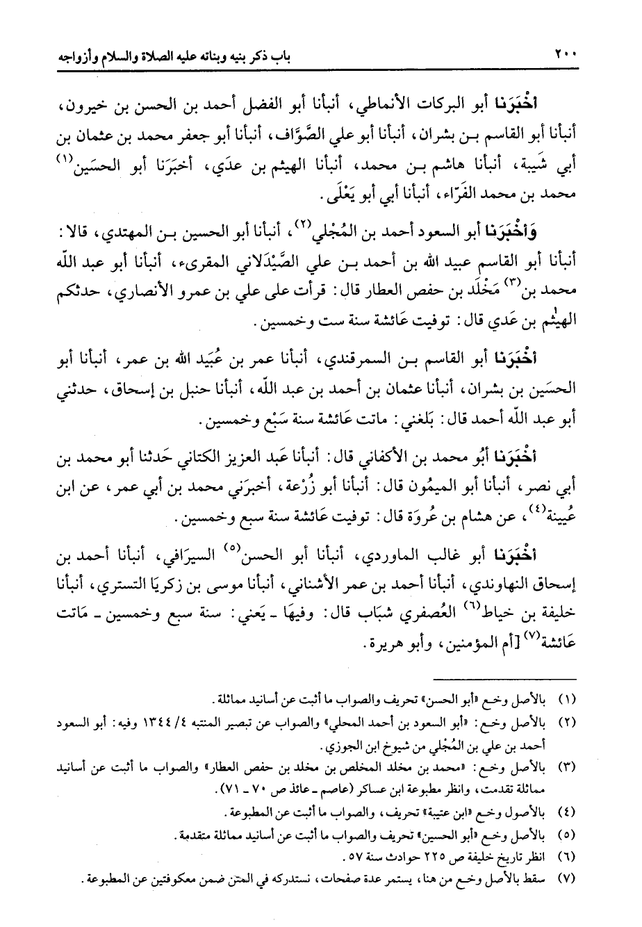 أخبرنا أبو البركات الأنماطي أنبأنا أبو الفضل أحمد بن الحسن بن خيرون أنبأنا أبو القاسم بن بشران أنبأنا أبو علي الصواف أنبأنا أبو جعفر محمد بن عثمان بن أبي شيبة أنبأنا هاشم بن محمد أنبأنا الهيثم بن عدي أخبرنا أبو الحسين (1) محمد بن محمد الفراء أنبأنا أبي أبو يعلى وأخبرنا أبو السعود أحمد بن المجلي (2) أنبأنا أبو الحسين بن المهتدي قالا أنبأنا أبو القاسم عبيد الله بن أحمد بن علي الصيدلاني المقرئ أنبأنا أبو عبد الله محمد بن (3) مخلد بن حفص العطار قال قرأت على علي بن عمرو الأنصاري حدثكم الهيثم بن عدي قال توفيت عائشة سنة ست وخمسين أخبرنا أبو القاسم بن السمرقندي أنبأنا عمر بن عبيد الله بن عمر أنبأنا أبو الحسين بن بشران أنبأنا عثمان بن أحمد بن عبد الله أنبأنا حنبل بن إسحاق حدثني أبو عبد الله أحمد قال بلغني ماتت عائشة سنة سبع وخمسين أخبرنا أبو محمد بن الأكفاني قال أنبأنا عبد العزيز الكتاني حدثنا أبو محمد بن أبي نصر أنبأنا أبو الميمون قال أنبأنا أبو زرعة أخبرني محمد بن أبي عمر عن ابن عيينة (4) عن هشام بن عروة قال توفيت عائشة سنة سبع وخمسين أخبرنا أبو غالب الماوردي أنبأنا أبو الحسن (5) السيرافي أنبأنا أحمد بن إسحاق النهاوندي أنبأنا أحمد بن عمر الأشناني أنبأنا موسى بن زكريا التستري أنبأنا خليفة بن خياط (6) العصفري شباب قال وفيها يعني سنة سبع وخمسين ماتت عائشة (7) أم المؤمنين وأبو هريرة