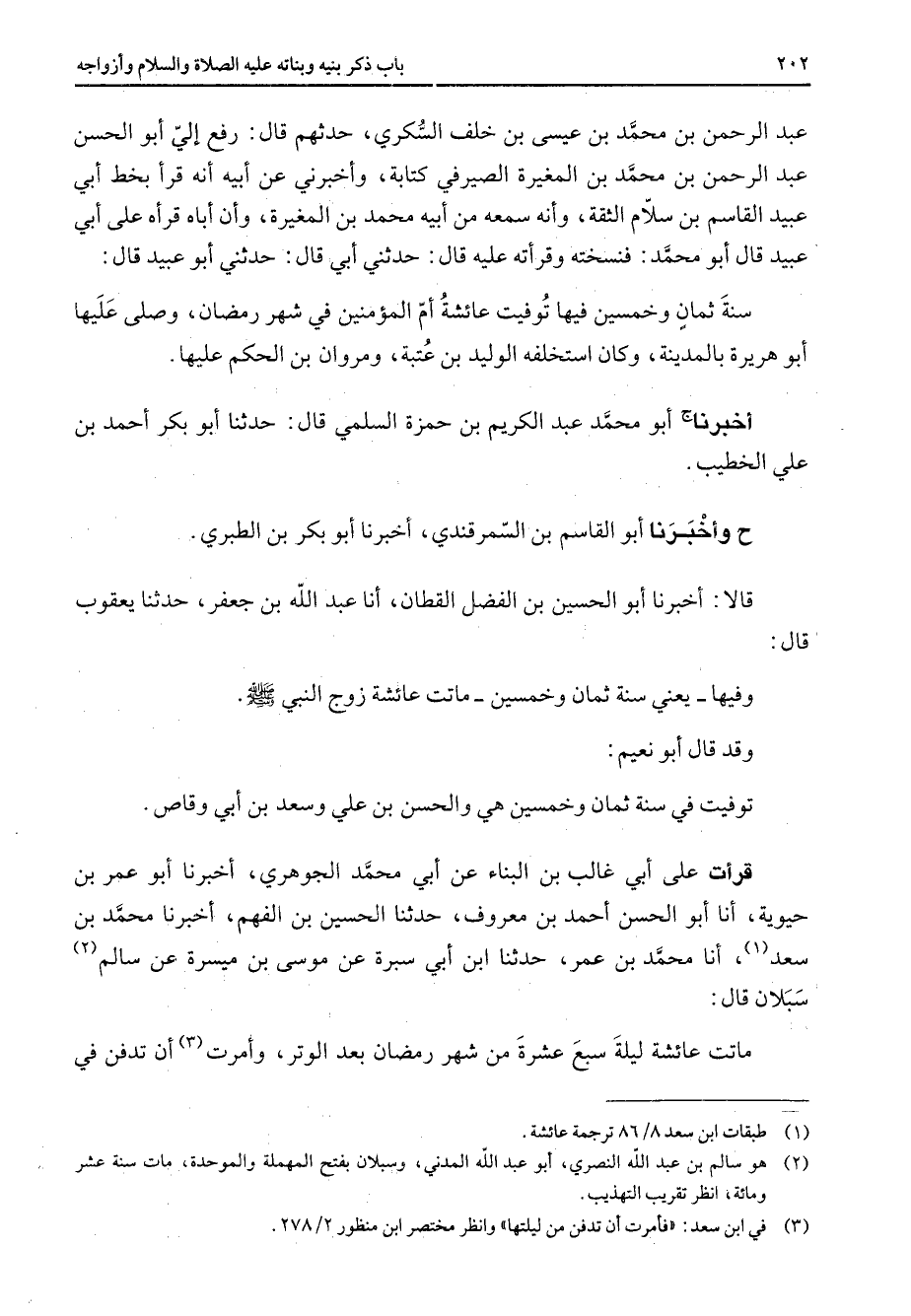 عبد الرحمن بن محمد بن عيسى بن خلف السكري حدثهم قال رفع إلي أبو الحسن عبد الرحمن بن محمد بن المغيرة الصيرفي كتابة وأخبرني عن أبيه أنه قرأ بخط أبي عبيد القاسم بن سلام الثقة وأنه سمعه من أبيه محمد بن المغيرة وأن أباه قرأه على أبي عبيد قال أبو محمد فنسخته وقرأته عليه قال حدثني أبي قال حدثني أبو عبيد قال سنة ثمان وخمسين فيها توفيت عائشة أم المؤمنين في شهر رمضان وصلى عليها أبو هريرة بالمدينة وكان استخلفه الوليد بن عتبة ومروان بن الحكم عليها أخبرنا أبو محمد عبد الكريم بن حمزة السلمي قال حدثنا أبو بكر أحمد بن علي الخطيب ح وأخبرنا أبو القاسم بن السمرقندي أخبرنا أبو بكر بن الطبري قالا أخبرنا أبو الحسين بن الفضل القطان أنا عبد الله بن جعفر حدثنا يعقوب قال وفيها يعني سنة ثمان وخمسين ماتت عائشة زوج النبي (صلى الله عليه وسلم) وقد قال أبو نعيم توفيت في سنة ثمان وخمسين هي والحسن بن علي وسعد بن أبي وقاص قرأت على أبي غالب بن البناء عن أبي محمد الجوهري أخبرنا أبو عمر بن حيوية أنا أبو الحسن أحمد بن معروف حدثنا الحسين بن الفهم أخبرنا محمد بن سعد (1) أنا محمد بن عمر حدثنا ابن ابي سبرة عن موسى بن ميسرة عن سالم (2) سبلان قال ماتت عائشة ليلة سبع عشرة من شهر رمضان بعد الوتر وأمرت (3) أن تدفن في