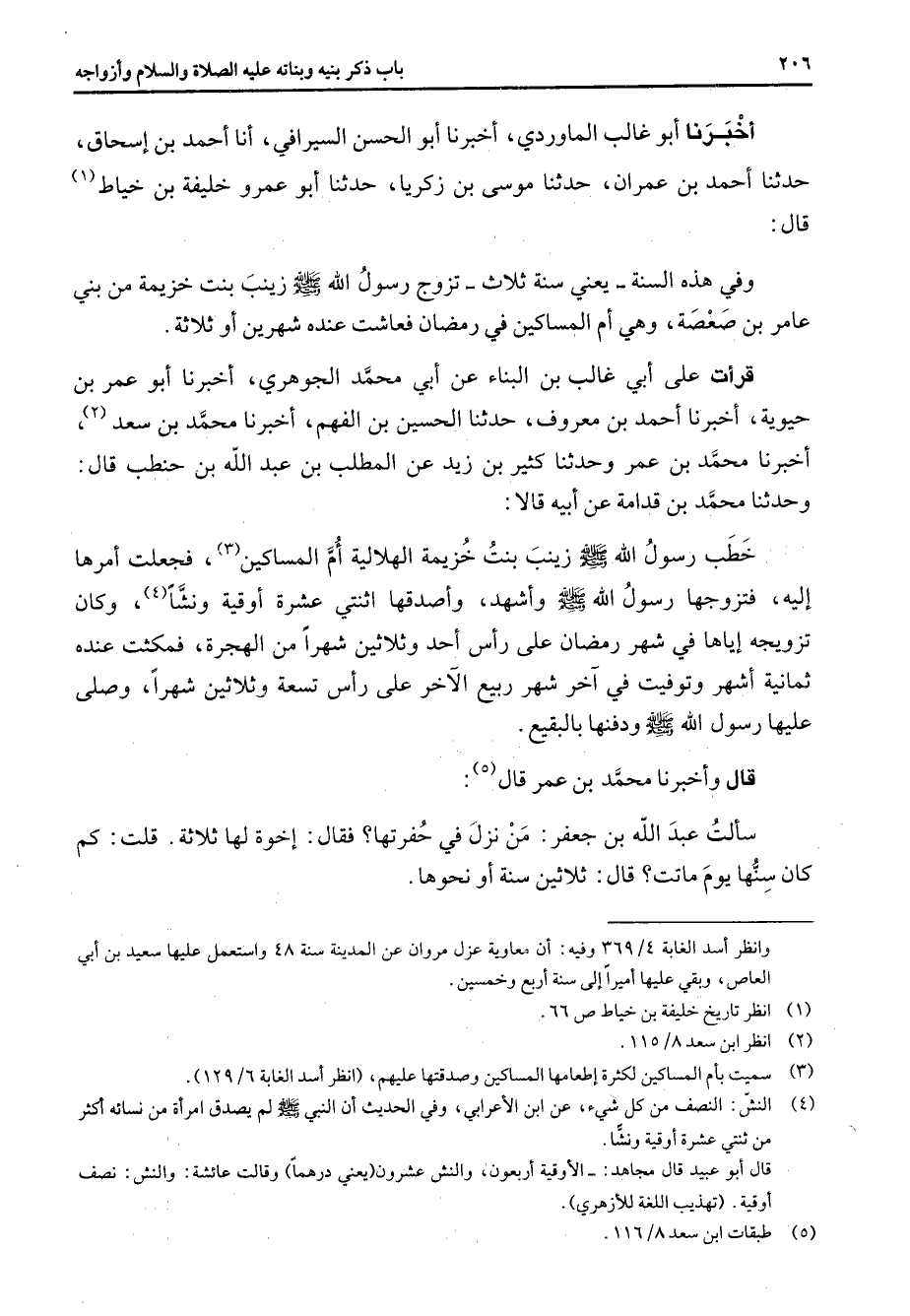 أخبرنا أبو غالب الماوردي أخبرنا أبو الحسن السيرافي أنا أحمد بن إسحاق حدثنا أحمد بن عمران حدثنا موسى بن زكريا حدثنا أبو عمرو خليفة بن خياط (1) قال وفي هذه السنة يعني سنة ثلاث تزوج رسول الله (صلى الله عليه وسلم) زينب بنت خزيمة من بني عامر بن صعصعة وهي أم المساكين في رمضان فعاشت عنده شهرين أو ثلاثة قرأت على أبي غالب بن البناء عن أبي محمد الجوهري أخبرنا أبو عمر بن حيوية أخبرنا أحمد بن معروف حدثنا الحسين بن الفهم أخبرنا محمد بن سعد (2) أخبرنا محمد بن عمر وحدثنا كثير بن زيد عن المطلب بن عبد الله بن حنطب قال وحدثنا محمد بن قدامة عن أبيه قالا خطب رسول الله (صلى الله عليه وسلم) زينب بنت خزيمة الهلالية أم المساكين (3) فجعلت أمرها إليه فتزوجها رسول الله (صلى الله عليه وسلم) وأشهد وأصدقها اثنتي عشرة أوقية ونشا (4) وكان تزويجه إياها في شهر رمضان على رأس أحد وثلاثين شهرا من الهجرة فمكثت عنده ثمانية أشهر وتوفيت في آخر شهر ربيع الآخر على رأس تسعة وثلاثين شهرا وصلى عليها رسول الله (صلى الله عليه وسلم) ودفنها بالبقيع قال وأخبرنا محمد بن عمر قال (5) سألت عبد الله بن جعفر من نزل في حفرتها فقال إخوة لها ثلاثة قلت كم كان سنها يوم ماتت قال ثلاثين سنة أو نحوها
