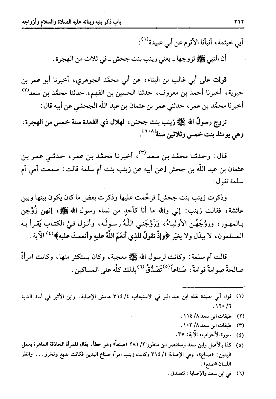 [608] قال وحدثنا محمد بن سعد أخبرنا محمد بن عمر حدثني عمر بن عثمان بن عبد الله بن جحش عن أبيه عن زينب بنت أم سلمة قالت سمعت أمي أم سلمة تقول وذكرت زينب بنت جحش فرحمت عليها وذكرت بعض ما كان يكون بينها وبين عائشة فقالت زينب إني والله ما أنا كأحد من نساء رسول الله (صلى الله عليه وسلم) إنهن زوجن بالمهور وزوجهن الأولياء وزوجني الله رسوله وأنزل في الكتاب يقرأ به المسلمون لا يبدل ولا يغير " وإذ تقول للذي أنعم الله عليه وأنعمت عليه " (4) الآية قالت أم سلمة وكانت لرسول الله (صلى الله عليه وسلم) معجبة وكان يستكثر منها وكانت امرأة صالحة صوامة قوامة صناعا (5) تصدق (6) بذلك كله على المساكين