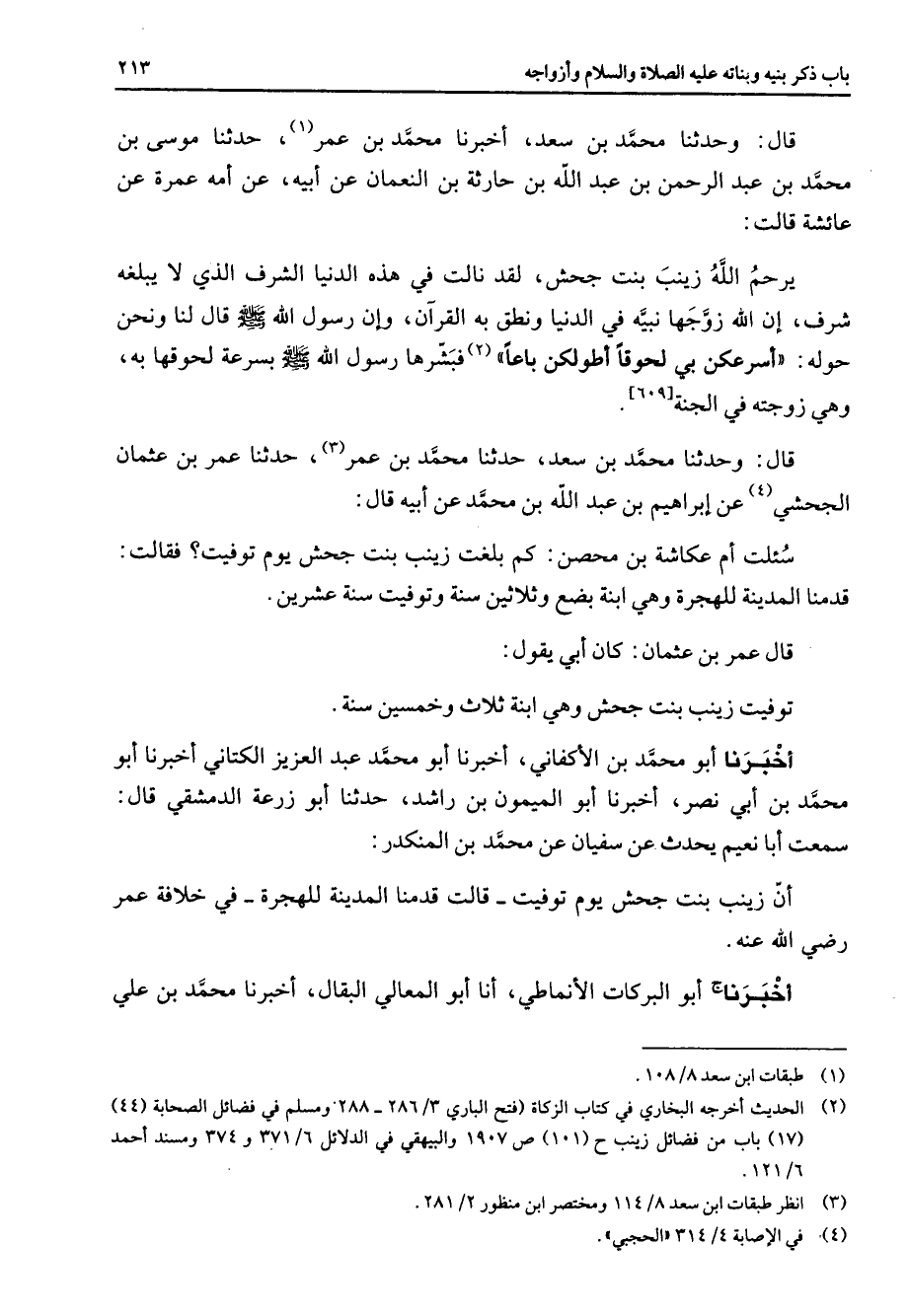 (2) الحديث أخرجه البخاري في كتاب الزكاة (فتح الباري 3 / 286 - 288 ومسلم في فضائل الصحابة (44) (17) باب من فضائل زينب ح (101) ص 1907 والبيهقي في الدلائل 3 / 371 و 374 ومسند أحمد 3 / 121