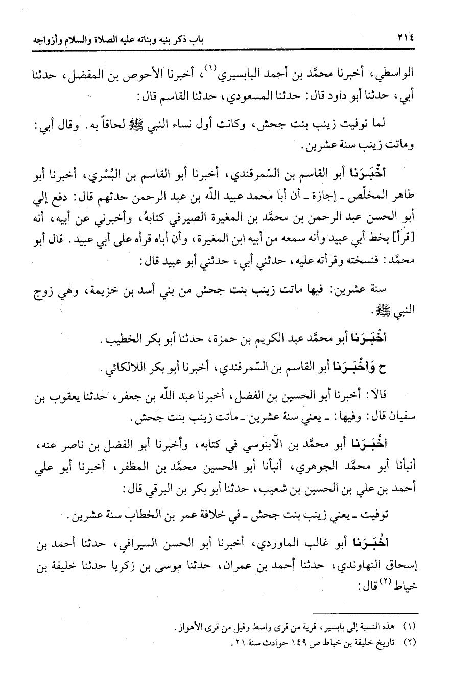الواسطي أخبرنا محمد بن أحمد البابسيري (1) أخبرنا الأحوص بن المفضل حدثنا أبي حدثنا أبو داود قال حدثنا المسعودي حدثنا القاسم قال لما توفيت زينب بنت جحش وكانت أول نساء النبي (صلى الله عليه وسلم) لحاقا به وقال أبي وماتت زينب سنة عشرين أخبرنا أبو القاسم بن السمرقندي أخبرنا أبو القاسم بن البسري أخبرنا أبو طاهر المخلص إجازة أن أبا محمد عبيد الله بن عبد الرحمن حدثهم قال دفع إلي أبو الحسن عبد الرحمن بن محمد بن المغيرة الصيرفي كتابه وأخبرني عن أبيه أنه قرأ بخط أبي عبيد وأنه سمعه من أبيه ابن المغيرة وأن أباه قرأه على أبي عبيد قال أبو محمد فنسخته وقرأته عليه حدثني أبي حدثني أبو عبيد قال سنة عشرين فيها ماتت زينب بنت جحش من بني أسد بن خزيمة وهي زوج النبي (صلى الله عليه وسلم) ح أخبرنا أبو محمد عبد الكريم بن حمزة حدثنا أبو بكر الخطيب وأخبرنا أبو القاسم بن السمرقندي أخبرنا أبو بكر اللالكائي قالا أخبرنا أبو الحسين بن الفضل أخبرنا عبد الله بن جعفر حدثنا يعقوب بن سفيان قال وفيها يعني سنة عشرين ماتت زينب بنت جحش أخبرنا أبو محمد بن الآبنوسي في كتابه وأخبرنا أبو الفضل بن ناصر عنه أنبأنا أبو محمد الجوهري أنبأنا أبو الحسين محمد بن المظفر أخبرنا أبو علي أحمد بن علي بن الحسين بن شعيب حدثنا أبو بكر بن البرقي قال توفيت يعني زينب بنت جحش في خلافة عمر بن الخطاب سنة عشرين أخبرنا أبو غالب الماوردي أخبرنا أبو الحسن السيرافي حدثنا أحمد بن إسحاق النهاوندي حدثنا أحمد بن عمران حدثنا موسى بن زكريا حدثنا خليفة بن خياط (2) قال