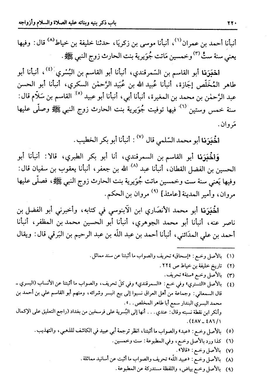 أنبأنا أحمد بن عمران (1) أنبأنا موسى بن زكريا حدثنا خليفة بن خياط (8) قال وفيها يعني سنة ست (3) وخمسين ماتت جويرية بنت الحارث زوج النبي (صلى الله عليه وسلم) أخبرنا أبو القاسم بن السمرقندي أنبأنا أبو القاسم بن البسري (4) أنبأنا أبو طاهر المخلص إجازة أنبأنا عبيد الله بن عبيد الرحمن السكري أنبأنا أبو الحسن عبد الرحمن بن محمد بن المغيرة أنبأنا أبي أنبأنا أبو عبيد (5) القاسم بن سلام قال سنة خمس وستين (6) فيها توفيت جويرية بنت الحارث زوج النبي (صلى الله عليه وسلم) وصلى عليها مروان أخبرنا أبو محمد السلمي قال (7) أنبأنا أبو بكر الخطيب وأخبرنا أبو القاسم بن السمرقندي أنا أبو بكر الطبري قالا أنبأنا أبو الحسين بن الفضل القطان أنبأنا عبد (8) الله بن جعفر أنبأنا يعقوب بن سفيان قال وفيها يعني سنة ست وخمسين ماتت جويرية بنت الحارث زوج النبي (صلى الله عليه وسلم) فصلى عليها مروان وأمير المدينة عامئذ (9) مروان بن الحكم أخبرنا أبو محمد الأنصاري ابن الآبنوسي في كتابه وأخبرني أبو الفضل بن ناصر عنه أنبأنا أبو محمد الجوهري أنبأنا أبو الحسين محمد بن المظفر أنبأنا أحمد بن علي المدائني أنبأنا أحمد بن عبد الله بن عبد الرحيم بن البرقي قال ويقال