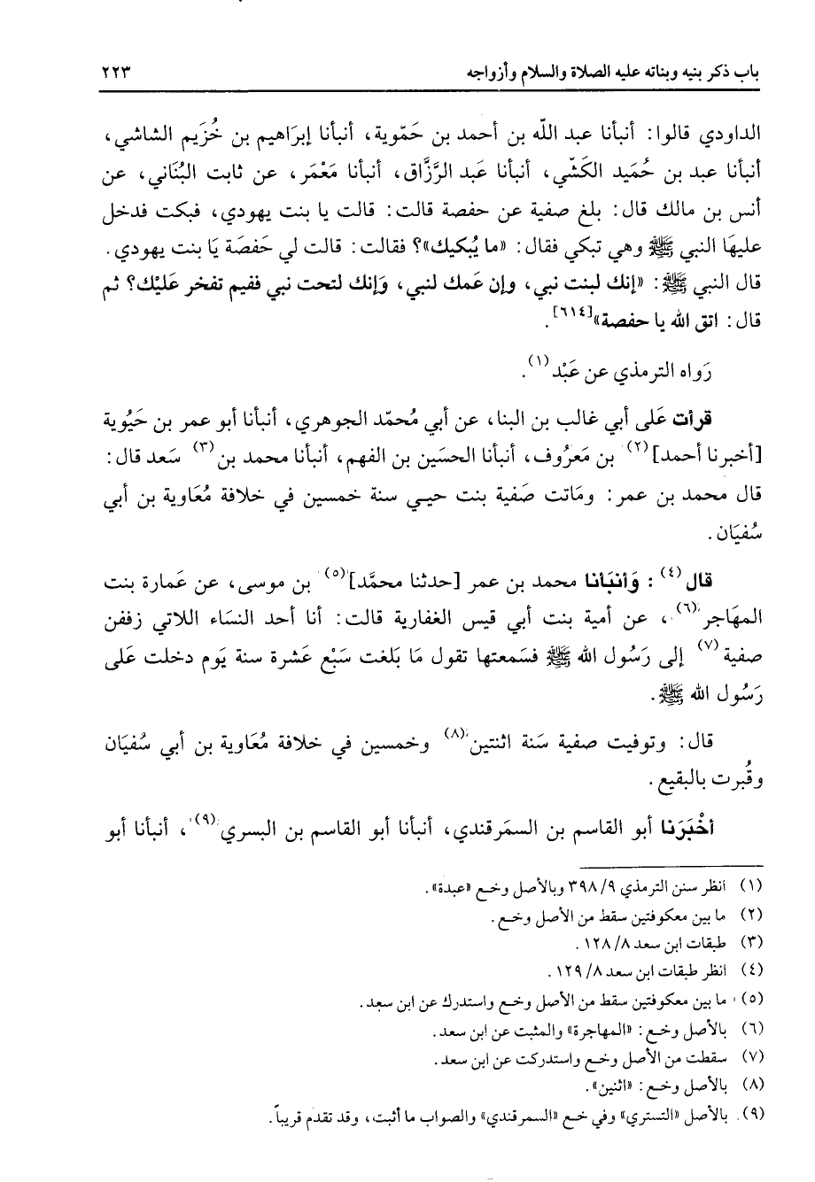 [614] رواه الترمذي عن عبد (1) قرأت على أبي غالب بن البنا عن أبي محمد الجوهري أنبأنا أبو عمر بن حيوية أخبرنا أحمد (2) بن معروف أنبأنا الحسين بن الفهم أنبأنا محمد بن (3) سعد قال قال محمد بن عمر وماتت صفية بنت حيي سنة خمسين في خلافة معاوية بن أبي سفيان قال (4) وأنبأنا محمد بن عمر حدثنا محمد (5) بن موسى عن عمارة بنت المهاجر (6) عن أمية بنت أبي قيس الغفارية قالت أنا أحد النساء اللاتي زففن صفية (7) إلى رسول الله (صلى الله عليه وسلم) فسمعتها تقول ما بلغت سبع عشرة سنة يوم دخلت على رسول الله (صلى الله عليه وسلم) قال وتوفيت صفية سنة اثنتين (8) وخمسين في خلافة معاوية بن أبي سفيان وقبرت بالبقيع أخبرنا أبو القاسم بن السمرقندي أنبأنا أبو القاسم بن البسري (9) أنبأنا أبو