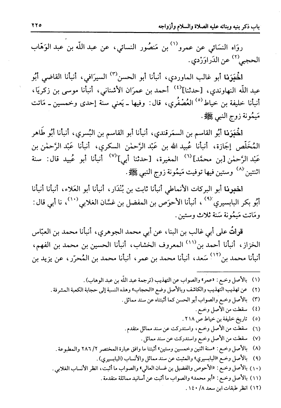 رواه النسائي عن عمرو (1) بن منصور النسائي عن عبد الله بن عبد الوهاب الحجبي (2) عن الدراوردي أخبرنا أبو غالب الماوردي أنبأنا أبو الحسن (3) السيرافي أنبأنا القاضي أبو عبد الله النهاوندي حدثنا (4) أحمد بن عمران الأشناني أنبأنا موسى بن زكريا أنبأنا خليفة بن خياط (5) العصفري قال وفيها يعني سنة إحدى وخمسين ماتت ميمونة زوج النبي (صلى الله عليه وسلم) اخبرنا أبو القاسم بن السمرقندي أنبأنا أبو القاسم بن البسري أنبأنا أبو طاهر المخلص إجازة أنبأنا عبيد الله بن عبد الرحمن السكري أنبأنا عبد الرحمن بن عبد الرحمن بن محمد (6) المغيرة حدثنا أبي (7) أنبأنا أبو عبيد قال سنة اثنتين (8) وستين فيها توفيت ميمونة زوج النبي (صلى الله عليه وسلم) أخبرنا أبو البركات الأنماطي أنبأنا ثابت بن بندار أنبأنا أبو العلاء أنبأنا أنبأنا أبو بكر البابسيري (9) أنبأنا الأحوص بن المفضل بن غسان الغلابي (10) نا أبي قال وماتت ميمونة سنة ثلاث وستين قرأت على أبي غالب بن البنا عن أبي محمد الجوهري أنبأنا محمد بن العباس الخزاز أنبأنا أحمد بن (11) المعروف الخشاب أنبأنا الحسين بن محمد بن الفهم أنبأنا محمد بن (12) سعد أنبأنا محمد بن عمر أنبأنا محمد بن المحرر عن يزيد بن