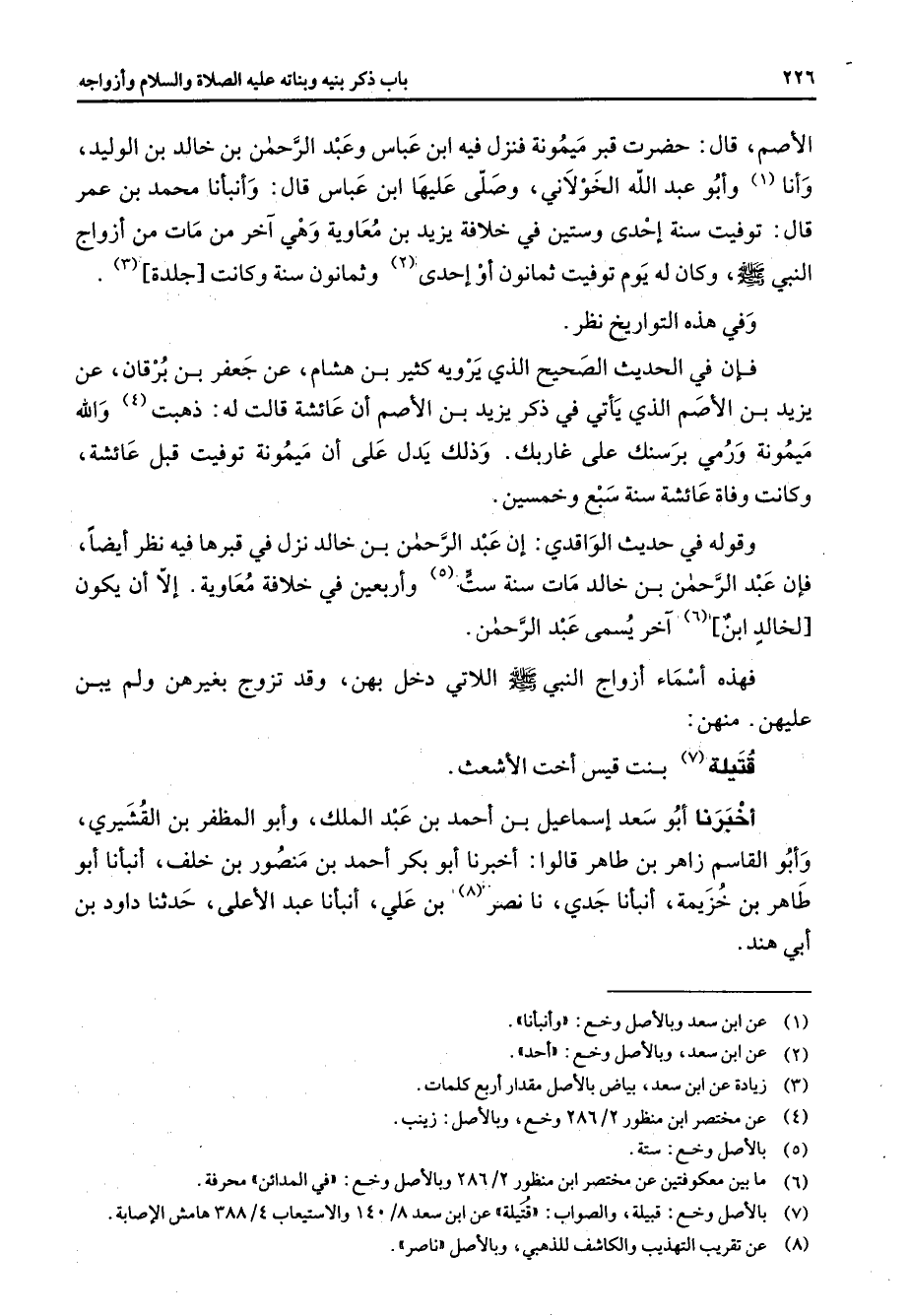 الأصم قال حضرت قبر ميمونة فنزل فيه ابن عباس وعبد الرحمن بن خالد بن الوليد وأنا (1) وأبو عبد الله الخولاني وصلى عليها ابن عباس قال وأنبأنا محمد بن عمر قال توفيت سنة إحدى وستين في خلافة يزيد بن معاوية وهي آخر من مات من أزواج النبي (صلى الله عليه وسلم) وكان له يوم توفيت ثمانون أو إحدى (2) وثمانون سنة وكانت جلدة (3) وفي هذه التواريخ نظر فإن في الحديث الصحيح الذي يرويه كثير بن هشام عن جعفر بن برقان عن يزيد بن الأصم الذي يأتي في ذكر يزيد بن الأصم أن عائشة قالت له ذهبت (4) والله ميمونة ورمي برسنك على غاربك وذلك يدل على أن ميمونة توفيت قبل عائشة وكانت وفاة عائشة سنة سبع وخمسين وقوله في حديث الواقدي إن عبد الرحمن بن خالد نزل في قبرها فيه نظر أيضا فإن عبد الرحمن بن خالد مات سنة ست (5) وأربعين في خلافة معاوية إلا أن يكون لخالد ابن (6) آخر يسمى عبد الرحمن فهذه أسماء أزواج النبي (صلى الله عليه وسلم) اللاتي دخل بهن وقد تزوج بغيرهن ولم يبن عليهن منهن قتيلة (7) بنت قس أخت الأشعث أخبرنا أبو سعد إسماعيل بن أحمد بن عبد الملك وأبو المظفر بن القشيري وأبو القاسم زاهر بن طاهر قالوا أخبرنا أبو بكر أحمد بن منصور بن خلف أنبأنا أبو طاهر بن خزيمة أنبأنا جدي نا نصر (8) بن علي أنبأنا عبد الأعلى حدثنا داود بن أبي هند