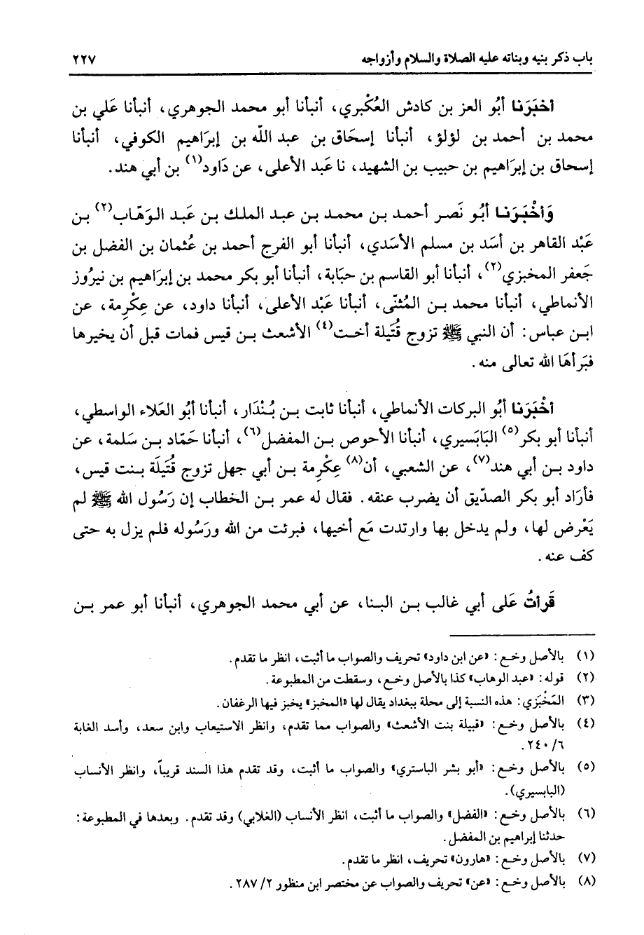 أخبرنا أبو العز بن كادش العكبري أنبأنا أبو محمد الجوهري أنبأنا علي بن محمد بن أحمد بن لؤلؤ أنبأنا إسحاق بن عبد الله بن إبراهيم الكوفي أنبأنا إسحاق بن إبراهيم بن حبيب بن الشهيد نا عبد الأعلى عن داود (1) بن أبي هند وأخبرنا أبو نصر أحمد بن محمد بن عبد الملك بن عبد الوهاب (2) بن عبد القاهر بن أسد بن مسلم الأسدي أنبأنا أبو الفرج أحمد بن عثمان بن الفضل بن جعفر المخبزي (3) أنبأنا أبو القاسم بن حبابة أنبأنا أبو بكر محمد بن إبراهيم بن نيروز الأنماطي أنبأنا محمد بن المثنى أنبأنا عبد الأعلى أنبأنا داود عن عكرمة عن ابن عباس أن النبي (صلى الله عليه وسلم) تزوج قتيلة أخت (4) الأشعث بن قيس فمات قبل أن يخيرها فبرأها الله تعالى منه أخبرنا أبو البركات الأنماطي أنبأنا ثابت بن بندار أنبأنا أبو العلاء الواسطي أنبأنا أبو بكر (5) البابسيري أنبأنا الأحوص بن المفضل (6) أنبأنا حماد بن سلمة عن داود بن أبي هند (7) عن الشعبي أن (8) عكرمة بن أبي جهل تزوج قتيلة بنت قيس فأراد أبو بكر الصديق أن يضرب عنقه فقال له عمر بن الخطاب إن رسول الله (صلى الله عليه وسلم) لم يعرض لها ولم يدخل بها وارتدت مع أخيها فبرئت من الله ورسوله فلم يزل به حتى كف عنه قرأت على أبي غالب بن البنا عن أبي محمد الجوهري أنبأنا أبو عمر بن