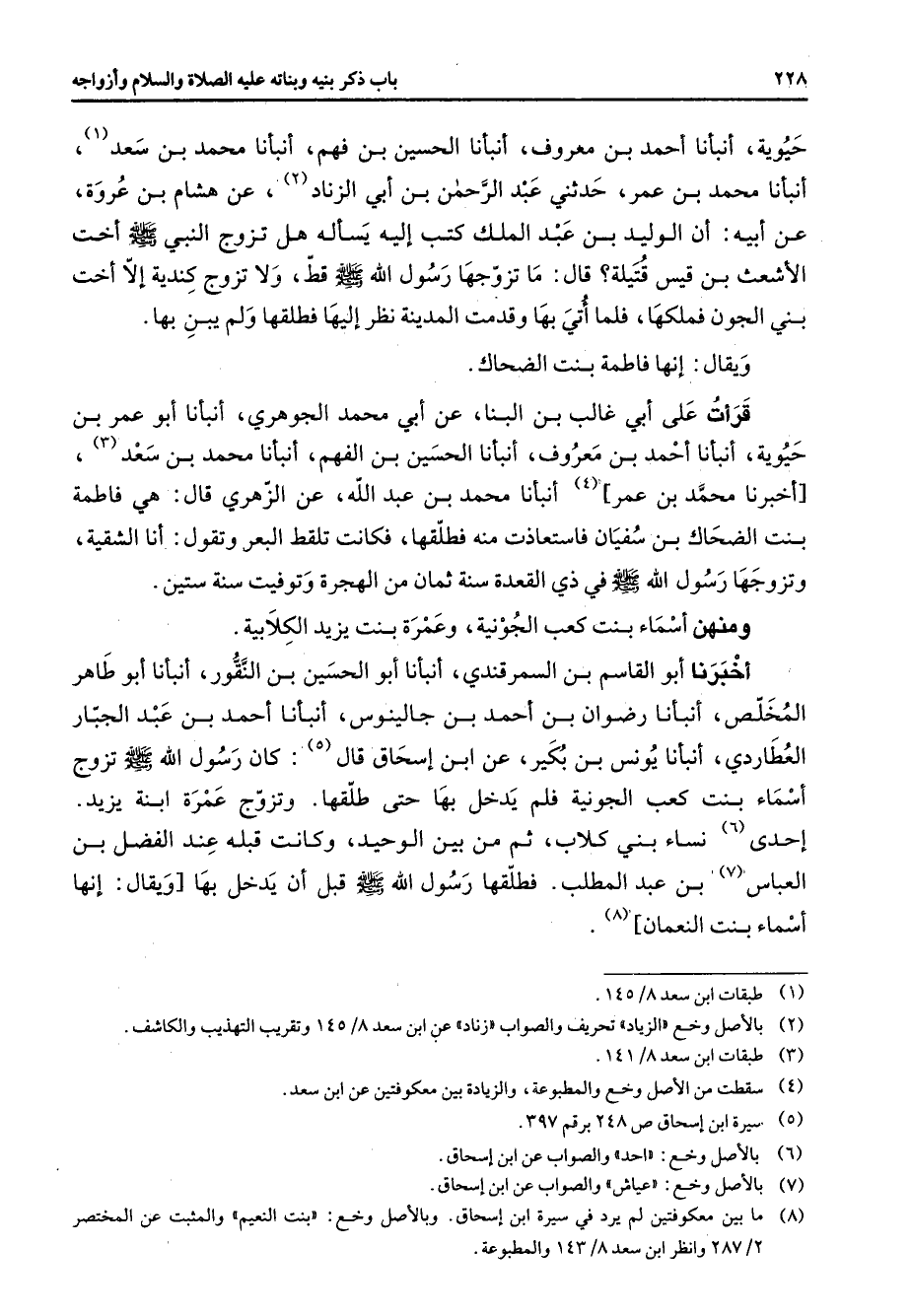 حيوية أنبأنا أحمد بن معروف أنبأنا الحسين بن فهم أنبأنا محمد بن سعد (1) أنبأنا محمد بن عمر حدثني عبد الرحمن بن أبي الزناد (2) عن هشام بن عروة عن أبيه أن الوليد بن عبد الملك كتب إليه يسأله هل تزوج النبي (صلى الله عليه وسلم) أخت الأشعث بن قيس قتيلة قال ما تزوجها رسول الله (صلى الله عليه وسلم) قط ولا تزوج كندية إلا أخت بني الجون فملكها فلما أتي بها وقدمت المدينة نظر إليها فطلقها ولم يبن بها ويقال إنها فاطمة بنت الضحاك قرأت على أبي غالب بن البنا عن أبي محمد الجوهري أنبأنا أبو عمر بن حيوية أنبأنا أحمد بن معروف أنبأنا الحسين بن الفهم أنبأنا محمد بن سعد (3) أخبرنا محمد بن عمر (4) أنبأنا محمد بن عبد الله عن الزهري قال هي فاطمة بنت الضحاك بن سفيان فاستعاذت منه فطلقها فكانت تلقط البعر وتقول أنا الشقية وتزوجها رسول الله (صلى الله عليه وسلم) في ذي القعدة سنة ثمان من الهجرة وتوفيت سنة ستين ومنهن أسماء بنت كعب الجونية وعمرة بنت يزيد الكلابية أخبرنا أبو القاسم بن السمرقندي أنبأنا أبو الحسين بن النقور أنبأنا أبو طاهر المخلص أنبأنا رضوان بن أحمد بن جالينوس أنبأنا أحمد بن عبد الجبار العطاردي أنبأنا يونس بن بكير عن ابن إسحاق قال (5) كان رسول الله (صلى الله عليه وسلم) تزوج أسماء بنت كعب الجونية فلم يدخل بها حتى طلقها وتزوج عمرة ابنة يزيد إحدى (6) نساء بني كلاب ثم من بين الوحيد وكانت قبله عند الفضل بن العباس (7) بن عبد المطلب فطلقها رسول الله (صلى الله عليه وسلم) قبل أن يدخل بها ويقال إنها أسماء بنت النعمان (8)