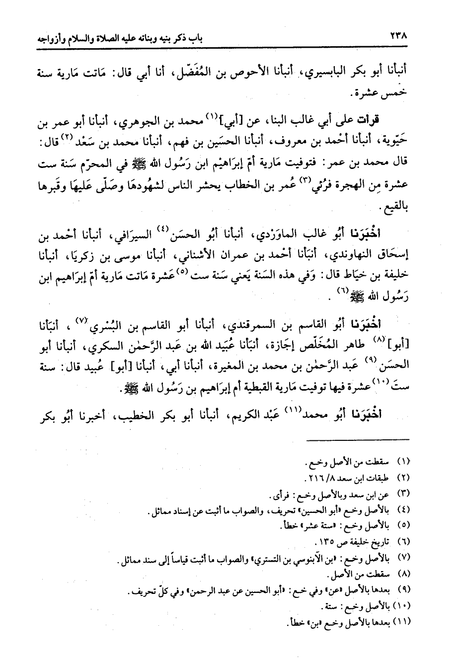 أنبأنا أبو بكر البابسيري أنبأنا الأحوص بن المفضل أنا أبي قال ماتت مارية سنة خمس عشرة قرأت على أبي غالب البنا عن أبي (1) محمد بن الجوهري أنبأنا أبو عمر بن حيوية أنبأنا أحمد بن معروف أنبأنا الحسين بن فهم أنبأنا محمد بن سعد (2) قال قال محمد بن عمر فتوفيت مارية أم إبراهيم ابن رسول الله (صلى الله عليه وسلم) في المحرم سنة ست عشرة من الهجرة فرئي (3) عمر بن الخطاب يحشر الناس لشهودها وصلى عليها وقبرها بالبقيع أخبرنا أبو غالب الماوردي أنبأنا أبو الحسن (4) السيرافي أنبأنا أحمد بن إسحاق النهاوندي أنبأنا أحمد بن عمران الأشناني أنبأنا موسى بن زكريا أنبأنا خليفة بن خياط قال وفي هذه السنة يعني سنة ست (5) عشرة ماتت مارية أم إبراهيم ابن رسول الله (صلى الله عليه وسلم) (6) أخبرنا أبو القاسم بن السمرقندي أنبأنا أبو القاسم بن البسري (7) أنبأنا أبو (8) طاهر المخلص إجازة أنبأنا عبيد الله بن عبد الرحمن السكري أنبأنا أبو الحسن (9) عبد الرحمن بن محمد بن المغيرة أنبأنا أبي أنبأنا أبو عبيد قال سنة ست (10) عشرة فيها توفيت مارية القبطية أم إبراهيم بن رسول الله (صلى الله عليه وسلم) أخبرنا أبو محمد (11) عبد الكريم أنبأنا أبو بكر الخطيب أخبرنا أبو بكر