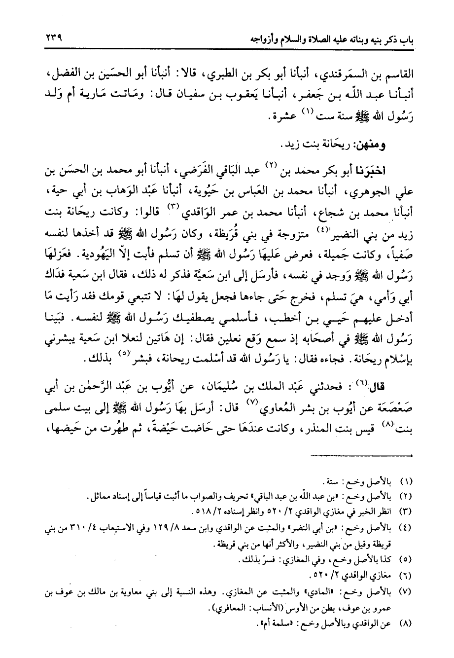 (4) بالاصل وخع: " بن أبي النضر " والمثبت عن الواقدي وابن سعد 8 / 129 وفي الاستيعاب 4 / 310 من بني قريظة وقيل من بني النضير والاكثر أنها من بني قريظة