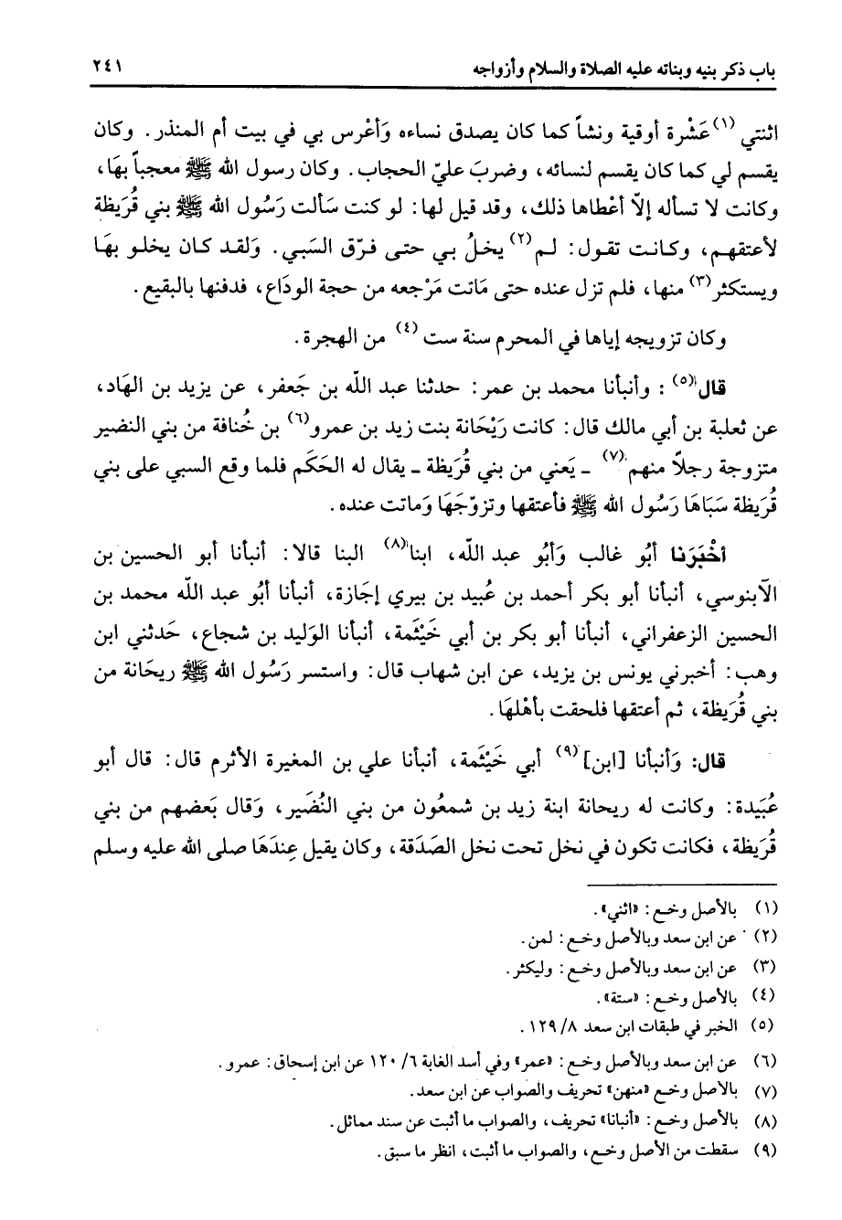 اثنتي (1) عشرة أوقية ونشا كما كان يصدق نساءه وأعرس بي في بيت أم المنذر وكان يقسم لي كما كان يقسم لنسائه وضرب علي الحجاب وكان رسول الله (صلى الله عليه وسلم) معجبا بها وكانت لا تسأله إلا أعطاها ذلك وقد قيل لها لو كنت سألت رسول الله (صلى الله عليه وسلم) بني قريظة لأعتقهم وكانت تقول لم (2) يخل بي حتى فرق السبي ولقد كان يخلو بها ويستكثر (3) منها فلم تزل عنده حتى ماتت مرجعه من حجة الوداع فدفنها بالبقيع وكان تزويجه إياها في المحرم سنة ست (4) من الهجرة قال (5) وأنبأنا محمد بن عمر حدثنا عبد الله بن جعفر عن يزيد بن الهاد عن ثعلبة بن أبي مالك قال كانت ريحانة بنت زيد بن عمرو (6) بن خنافة من بني النضير متزوجة رجلا (7) منهم يعني من بني قريظة يقال له الحكم فلما وقع السبي على بني قريظة سباها رسول الله (صلى الله عليه وسلم) فأعتقها وتزوجها وماتت عنده أخبرنا أبو غالب وأبو عبد الله ابنا (8) البنا قالا أنبأنا أبو الحسين بن الآبنوسي أنبأنا أبو بكر أحمد بن عبيد بن بيري إجازة أنبأنا أبو عبد الله محمد بن الحسين الزعفراني أنبأنا أبو بكر بن أبي خيثمة أنبأنا الوليد بن شجاع حدثني ابن وهب أخبرني يونس بن يزيد عن ابن شهاب قال واستسر رسول الله (صلى الله عليه وسلم) ريحانة من بني قريظة ثم أعتقها فلحقت بأهلها قال وأنبأنا ابن (9) أبي خيثمة أنبأنا علي بن المغيرة الأثرم قال قال أبو عبيدة وكانت له ريحانة ابنة زيد بن شمعون من بني النضير وقال بعضهم من بني قريظة فكانت تكون في نخل تحت نخل الصدقة وكان يقيل عندها صلى الله عليه وسلم