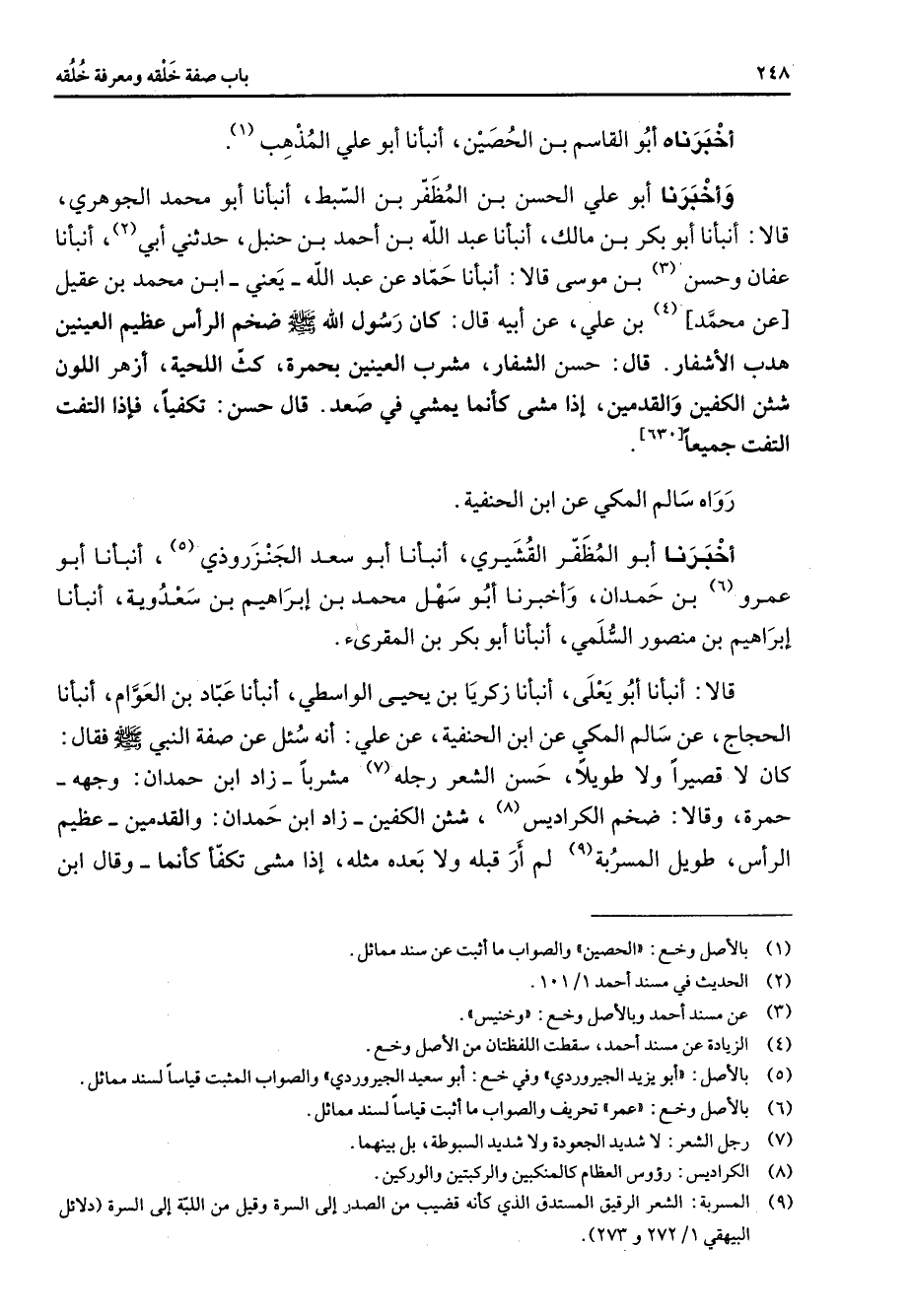 أخبرناه أبو القاسم بن الحصين أنبأنا أبو علي المذهب (1) وأخبرنا أبو علي الحسن بن المظفر بن السبط أنبأنا أبو محمد الجوهري قالا أنبأنا أبو بكر بن مالك أنبأنا عبد الله بن أحمد بن حنبل حدثني أبي (2) أنبأنا عفان وحسن (3) بن موسى قالا أنبأنا حماد عن عبد الله يعني ابن محمد بن عقيل عن محمد (4) بن علي عن أبيه قال كان رسول الله (صلى الله عليه وسلم) ضخم الرأس عظيم العينين هدب الأشفار قال حسن الشفار مشرب العينين بحمرة كث اللحية أزهر اللون شثن الكفين والقدمين إذا مشى كأنما يمشي في صعد قال حسن تكفيا فإذا التفت التفت جميعا