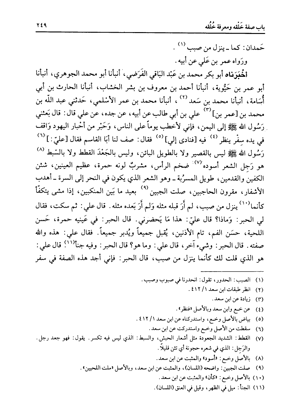 حمدان كما ينزل من صبب (1) ورواه عمر بن علي عن أبيه أخبرناه أبو بكر محمد بن عبد الباقي الفرضي أنبأنا أبو محمد الجوهري أنبأنا أبو عمر بن حيوية أنبأنا أحمد بن معروف بن بشر الخشاب أنبأنا الحارث بن أبي أسامة أنبأنا محمد بن سعد (2) أنبأنا محمد بن عمر الأسلمي حدثني عبد الله بن محمد بن عمر بن (3) علي بن أبي طالب عن أبيه عن جده عن علي قال قال بعثني رسول الله (صلى الله عليه وسلم) إلى اليمن فإني لأخطب يوما على الناس وحبر من أحبار اليهود واقف في يده سفر ينظر (4) فيه فنادى إلي (5) فقال صف لنا أبا القاسم فقال علي (6) رسول الله (صلى الله عليه وسلم) ليس بالقصير ولا بالطويل البائن وليس بالجعد القطط ولا بالسبط (8) هو رجل الشعر أسوده (7) ضخم الرأس مشرب لونه حمرة عظيم العينين شثن الكفين والقدمين طويل المسربة وهو الشعر الذي يكون في النحر إلى السرة أهدب الأشفار مقرون الحاجبين صلت الجبين بعيد ما بين المنكبين إذا مشى يتكفأ كأنما (10) ينزل من صبب لم أر قبله مثله ولم أر بعده مثله قال علي ثم سكت فقال لي الحبر وماذا قال علي هذا ما يحضرني قال الحبر في عينيه حمرة حسن اللحية حسن اللحية حسن الفم تام الأذنين يقبل جميعا ويدبر جميعا فقال علي هذه والله صفته قال الحبر وشئ آخر قال علي وما هو قال الحبر وفيه جنأ (11) قال علي هو الذي قلت لك كأنما ينزل من صبب قال الحبر فإني أجد هذه الصفة في سفر