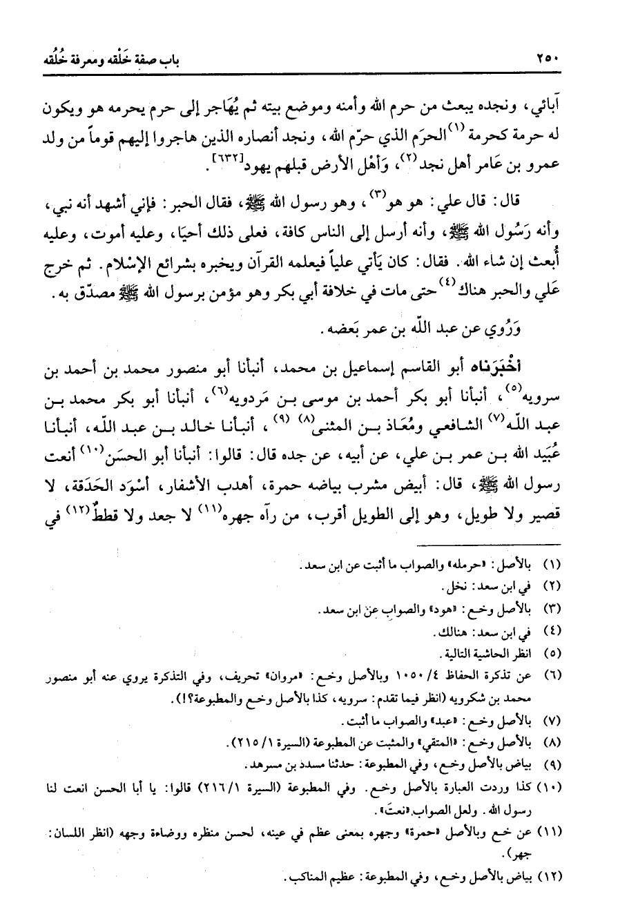 [632] قال قال علي هو هو (3) وهو رسول الله (صلى الله عليه وسلم) فقال الحبر فإني أشهد أنه نبي وأنه رسول الله (صلى الله عليه وسلم) وأنه أرسل إلى الناس كافة فعلى ذلك أحيا وعليه أموت وعليه أبعث إن شاء الله فقال كان يأتي عليا فيعلمه القرآن ويخبره بشرائع الإسلام ثم خرج علي والحبر هناك (4) حتى مات في خلافة أبي بكر وهو مؤمن برسول الله (صلى الله عليه وسلم) مصدق به وروي عن عبد الله بن عمر بعضه أخبرناه أبو القاسم إسماعيل بن محمد أنبأنا أبو منصور محمد بن أحمد بن سرويه (5) أنبأنا أبو بكر أحمد بن موسى بن مردويه (6) أنبأنا أبو بكر محمد بن عبد الله الشافعي ومعاذ بن المثنى (8) (9) أنبأنا خالد بن عبد الله أنبأنا عبيد الله بن عمر بن علي عن أبيه عن جده قال قالوا أنبأنا أبو الحسن (10) أنعت رسول الله (صلى الله عليه وسلم) قال أبيض مشرب بياضه حمرة أهدب الأشفار أسود الحدقة لا قصير ولا طويل وهو إلى الطويل أقرب من رآه جهره (11) لا جعد ولاقطط في