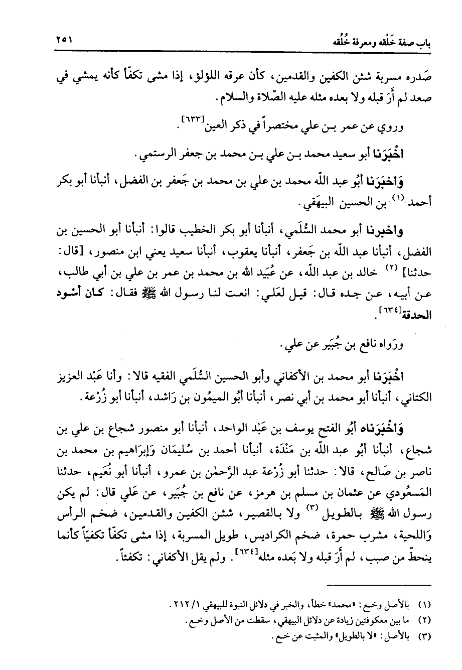 [634] ورواه نافع بن جبير عن علي أخبرنا أبو محمد بن الأكفاني وأبو الحسين السلمي الفقيه قالا وأنا عبد العزيز الكتاني أنبأنا أبو محمد بن أبي نصر أنبأنا أبو الميمون بن راشد أنبأنا أبو زرعة وأخبرناه أبو الفتح يوسف بن عبد الواحد أنبأنا أبو منصور شجاع بن علي بن شجاع أنبأنا أبو عبد الله بن مندة أنبأنا أحمد بن سليمان وإبراهيم بن محمد بن ناصر بن صالح قالا حدثنا أبو زرعة عبد الرحمن بن عمرو أنبأنا أبو نعيم حدثنا المسعودي عن عثمان بن مسلم بن هرمز عن نافع بن جبير عن علي قال لم يكن رسول الله (صلى الله عليه وسلم) بالطويل (3) ولا بالقصير شثن الكفين والقدمين ضخم الرأس واللحية مشربحمرة ضخم الكراديس طويل المسربة إذا مشى تكفأ تكفيا كأنما ينحط من صبب لم أقبله ولا بعده مثله
