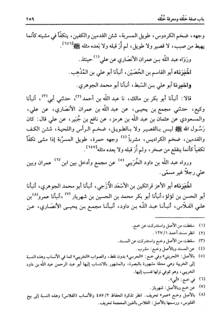 [646] ورواه عبد الله بن عمران الأنصاري عن علي (1) حينئذ أخبرناه أبو القاسم بن الحصين أنبأنا أبو علي بن المذهب وأخبرنا أبو علي بن السبط أنبأنا أبو محمد الجوهري قالا أنبأنا أبو بكر بن مالك نا عبد الله بن أحمد (2) حدثني أبي (3) أنبأنا وكيع حدثني مجمع بن يحيى عن عبد الله بن عمران الأنصاري عن علي والمسعودي عن عثمان بن عبد الله بن هرمز عن نافع بن جبير عن علي قال كان رسول الله (صلى الله عليه وسلم) ليس بالقصير ولا بالطويل ضخم الرأ س واللحية شثن الكف والقدمين ضخم الكراديس مشربا (4) وجهه حمرة طويل المسربة إذا مشتكفأ تكفيا كأنما ينقلع من صخر ولم أر قبله ولا بعده مثله