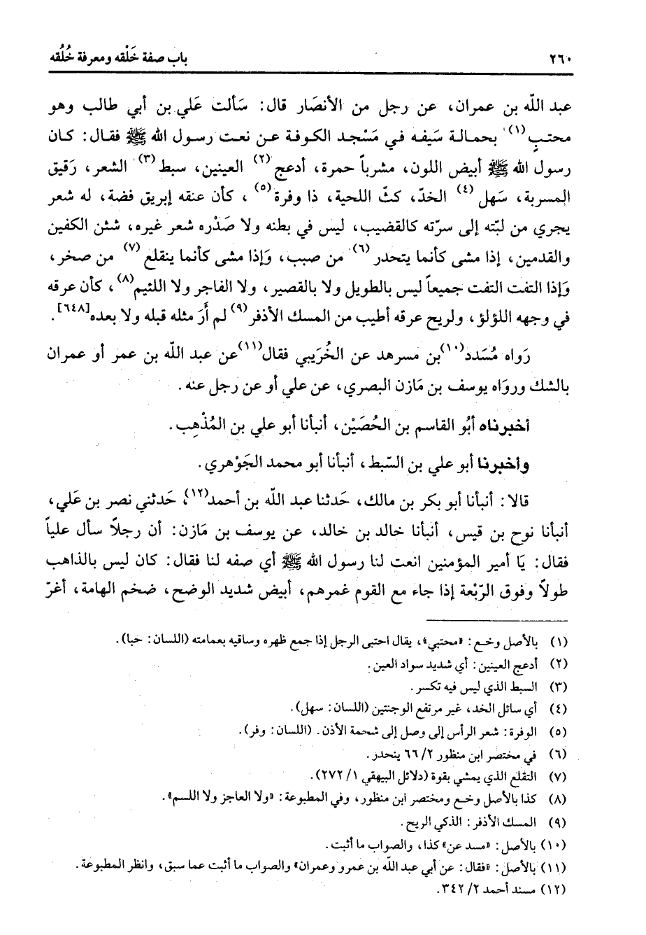 عبد الله بن عمران عن رجل من الأنصاري قال سألت علي بن أبي طالب وهو محتب (1) بحمالة سيفه في مسجد الكوفة عن نعت رسول الله (صلى الله عليه وسلم) فقال كان رسول الله (صلى الله عليه وسلم) أبيض اللون مشربا حمرة أدعج (2) العينين سبط (3) الشعر رقيق المسربة سهل (4) الخدكث اللحية ذا وفرة (5) كأن عنقه إبريق فضة له شعر يجري من لبته إلى سرته كالقضيب ليس في بطنه ولا صدره شعر غيره شثن الكفين والقدمين إذا مشى كأنما يتحدر (6) من صبب وإذمشى كأنما ينقلع (7) من صخر وإذا التفت التفت جميعا ليس بالطويل ولا بالقصير ولا الفاجر ولا اللئيم (8) كأن عرقه في وجهه اللؤلؤ ولريح عرقه أطيب من المسك الأذفر (9) لم أر مثله قبله ولا بعده رواه مسدد (10) بن مسرهد عن الخريبي فقال (11) عن عبد الله بن عمر أو عمران بالشك ورواه يوسف بن مازن البصري عن علي أو عن رجل عنه أخبرناه أبو القاسم بن الحصين أنبأنا أبو علي بن المذهب وأخبرنا أبو علي بن السبط أنبأنا أبو محمد الجوهري قالا أنبأنا أبو بكر بن مالك حدثنا عبد الله بن أحمد (12) حدثني نصر بن علي أنبأنا نوح بن قيس أنبأنا خالد بن خالد عن يوسف بن مازن أن رجلا سأل عليا فقال يا أمير المؤمنين انعت لنا رسول الله (صلى الله عليه وسلم) أي صفلنا فقال كان ليس بالذاهب طولا وفوق الربعة إذا جاء مع القوم غمرهم أبيض شديد الوضح ضخم الهامة أغر