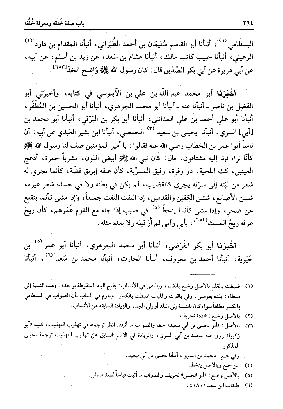 البسطامي (1) أنبأنا أبو القاسم سليمان بن أحمد الطبراني أنبأنا المقدام بن داود (2) الرعيني أنبأنا حبيب كانت مالك أنبأنا هشام بن سعد عن زيد بن أسلم عن أبيه عن أبي هريرة عن أبي بكر الصديق قال كان رسول الله (صلى الله عليه وسلم) واضح الخد