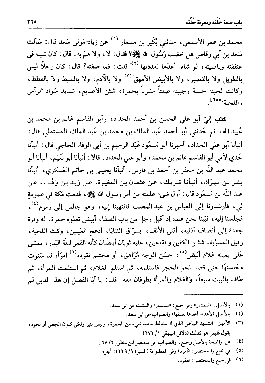 [655] كتب إلي أبو علي الحسن بن أحمد الحداد وأبو القاسم غانم بن محمد بن عبيد الله ثم حدثني أبو أحمد عبد الملك بن محمد بن عبد الملك المستملي قال أنبأنا أبو علي الحداد أخبرنا أبو مسعود عبد الرحيم بن أبي الوفاء الحاجي قال أنبأنا جدي لأمي أبو القاسم غانم بن محمد وابو علي الحداد قالا أنبأنا أبو نعيم أنبأنا أبو محمد عبد الله بن جعفر بن أحمد بن فارس أنبأنا يحيى بن حاتم العسكري أنبأنا بشر بن مهران أنبأنا شريك عن عثمان بن المغيرة عن زيد بن وهب عن عبد الله بن مسعود قال أول شئ علمته من أمر رسول الله (صلى الله عليه وسلم) قدمت مكة في عمومة لي فأرشدونا إلى العباس بن عبد المطلب فانتهينا إليه وهو جالس إلى زمزم (4) فجلسنا إليه فبينا نحن عنده إذ أقبل رجل من باب الصفا أبيض تعلوه حمرة له وفرة جعدة إلى أنصاف أذنيه أقنى الأنف براق الثنايا أدعج العينين وكث اللحية رقيق المسربة شثن الكفين والقدمين عليه ثوبان أبيضان كأنه القمر ليلة البدر يمشي على يمينه غلام أبيض (5) حسن الوجه مراهق أو محتلم تقوده (6) امرأة قد سترت محاسنها حتى قصد نحو الحجر فاستلمه ثم استلم الغلام ثم استلمت المرأة ثم طاف بالبيت سبعا والغلام والمرأة يطوفان معه قلنا يا أبا الفضل إن هذا الدين لم