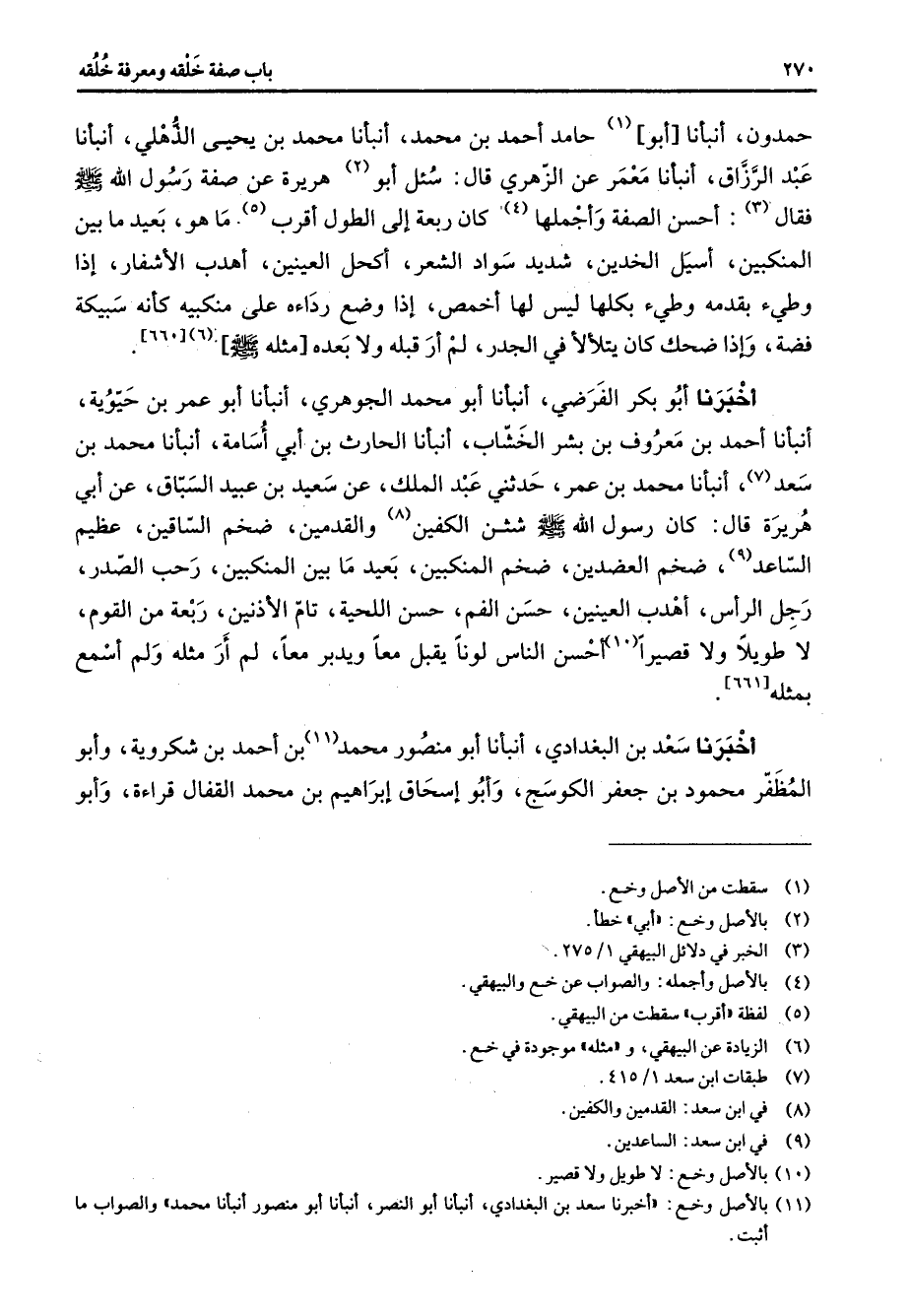 [660] أخبرنا أبو بكر الفرضي أنبأنا أبو محمد الجوهري أنبأنا أبو عمر بن حيوية أنبأنا أحمد بن معروف بن بشر الخشاب أنبأنا الحارث بن أبي أسامة أنبأنا محمد بن سعد (7) أنبأنا محمد بن عمر حدثني عبد الملك عن سعيد بن عبيد السباق عن أبي هريرة قال كان رسول الله (صلى الله عليه وسلم) شثن الكفين (8) والقدمين ضخم الساقين عظيم الساعد (9) ضخم العضدين ضخم المنكبين بعيد ما بين المنكبين رحب الصدر رجل الرأس أهدب العينين حسن الفم حسن اللحية تام الاذنين ربعة من القوم لا طويلا ولا قصيرا (10) أحسن الناس لونا يقبل معا ويدبر معا لم أر مثله ولم أسمع بمثله