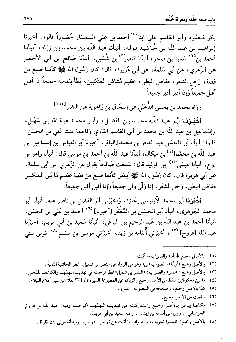 بكر محمود وأبو القاسم علي ابنا (1) أحمد بن علي السمسار حضورا قالوا أخبرنا إبراهيم بن عبد الله بن خرشيد قوله أنبأنا عبد الله بن محمد بن زياد أنبأنا أحمد بن (2) سعيد بن صخر أنبأنا النضر (3) بن شميل أنبأنا صالح بن أبي الأخضر عن الزهري عن أبي سلمة عن أبي هريرة قال كان رسول الله (صلى الله عليه وسلم) كأنما صيغ من فضة رجل الشعر مفاض البطن عظيم مشاش المنكبين يطأ بقدميه جميعا إذا أقبل أقبل جميعا وإذا أدبر أدبر جميعا رواه محمد بن يحيى الذهلي عن إسحاق بن راهوية عن النضر
