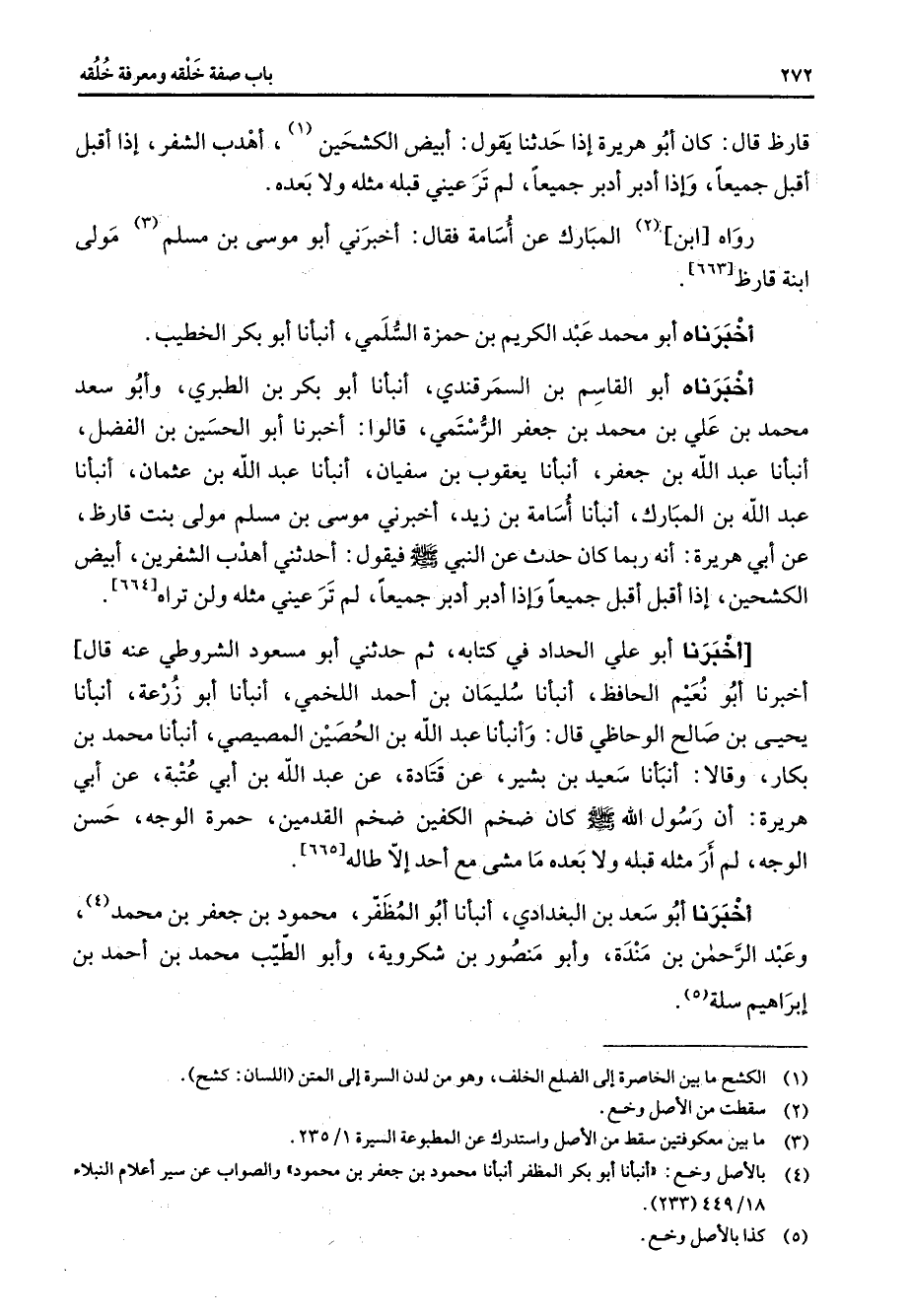 [663] أخبرناه أبو محمد عبد الكريم بن حمزة السلمي أنبأنا أبو بكر الخطيب أخبرناه أبو القاسم بن السمرقندي أنبأنا أبو بكر بن الطبري وأبو سعد محمد بن علي بن محمد بن جعفر الرستمي قالوا أخبرنا أبو الحسين بن الفضل أنبأنا عبد الله بن جعفر أنبأنا يعقوب بن سفيان أنبأنا عبد الله بن عثمان أنبأنا عبد الله بن المبارك أنبأنا أسامة بن زيد أخبرني موسى بن مسلم مولى بنت قارظ عن أبي هريرة أنه ربما كان حدث عن النبي (صلى الله عليه وسلم) فيقول أحدثي أهدب الشفرين أبيض الكشحين إذا أقبل أقبل جميعا وإذا أدبر أدبر جميعا لم تر عيني مثله ولن تراه