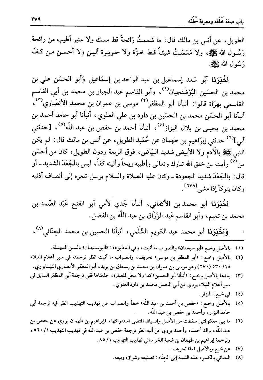 الطويل عن أنس بن مالك قال ما شممت رائحة قط مسك ولا عنبر أطيب من رائحة رسول الله (صلى الله عليه وسلم) ولا مسست شيئا قط خزة ولا حريرة ألين ولا أحسن من كف رسول الله (صلى الله عليه وسلم) أخبرنا أبو سعد إسماعيل بن عبد الواحد بن إسماعيل وأبو الحسن علي بن محمد بن الحسين البوشنجيان (1) وأبو القاسم عبد الجبار بن محمد بن أبي القاسم القاسمي بهراة قالوا أنبأنا أبو المظفر (2) موسى بن عمران بن محمد الأنصاري أنبأنا أبو الحسن محمد بن الحسين بن داود بن علي العلوي أنبأنا أبو حامد أحمد بن محمد بن يحيى بن بلال البزاز (4) أنبأنا أحمد بن حفص بن عبد الله (5) حدثني أبي (6) حدثني إبراهيم بن طهمان عن حميد الطويل عن أنس بن مالك قال لم يكن النبي (صلى الله عليه وسلم) بالآدم ولا الأبيض شديد البياض فوق الربعة ودون الطويل كان من أحسن من (7) رأيت من خلق الله تبارك وتعالى وأطيبه ريحا وألينه كفا ليس بالجعد الشديد أو قال بالجعد شديد الجعودة وكان عليه الصلاة والسلام يرسل شعره إلى أنصاف أذنيه وكان يتوكأ إذا مشى