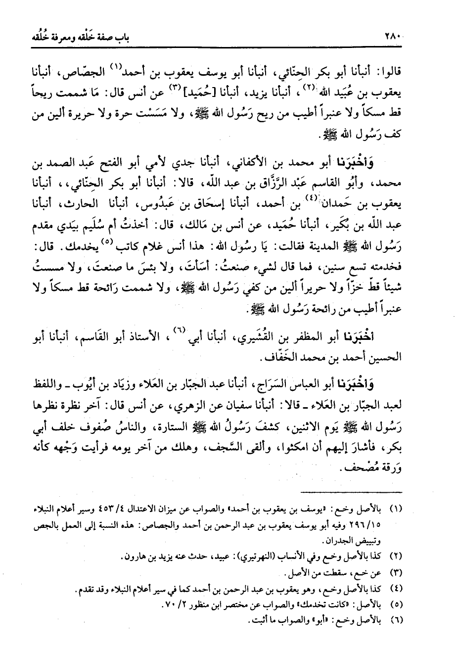 قالوا أنبأنا أبو بكر الحنائي أنبأنا أبو يوسف يعقوب بن أحمد (1) الجصاص أنبأنا يعقوب بن عبيد الله (2) أنبأنا يزيد أنبأنا حميد (3) عن أنس قال ما شممت ريحا قط مسكا ولا عنبرا أطيب من ريح رسول الله (صلى الله عليه وسلم) ولا مسست حرة ولا حريرة ألين من كف رسول الله (صلى الله عليه وسلم) وأخبرنا أبو محمد بن الأكفاني أنبأنا جدي لأمي أبو الفتح عبد الصمد بن محمد وأبو القاسم عبد الرزاق بن عبد الله قالا أنبأنا أبو بكر الحنائي أنبأنا يعقوب بن حمدان (4) بن أحمد أنبأنا إسحاق بن عبدوس أنبأنا الحارث أنبأنا عبد الله بن بكير أنبأنا حميد عن أنس بن مالك قال أخذت أم سليم بيدي مقدم رسول الله (صلى الله عليه وسلم) المدينة فقالت يا رسول الله هذا أنس غلام كاتب (5) يخدمك قال فخدمته تسع سنين فما قال لشئ صنعت أسأت ولا بئس ما صنعت ولا مسست شيئا قط خزا ولا حريرا ألين من كفي رسول الله (صلى الله عليه وسلم) ولا شممت رائحة قط مسكا ولا عنبرا أطيب من رائحة رسول الله (صلى الله عليه وسلم) أخبرنا أبو المظفر بن القشيري أنبأنا أبي (6) الأستاذ أبو القاسم أنبأنا أبو الحسين أحمد بن محمد الخفاف وأخبرنا أبو العباس السراج أنبأنا عبد الجبار بن العلاء وزياد بن أيوب واللفظ لعبد الجبار بن العلاء قالا أنبأنا سفيان عن الزهري عن أنس قال آخر نظرة نظرها رسول الله (صلى الله عليه وسلم) يوم الاثنين كشف رسول الله (صلى الله عليه وسلم) الستارة والناس صفوف خلف أبي بكر فاشار إليهم أن امكثوا وألقى السجف وهلك من آخر يومه فرأيت وجهه كأنه ورقة مصحف