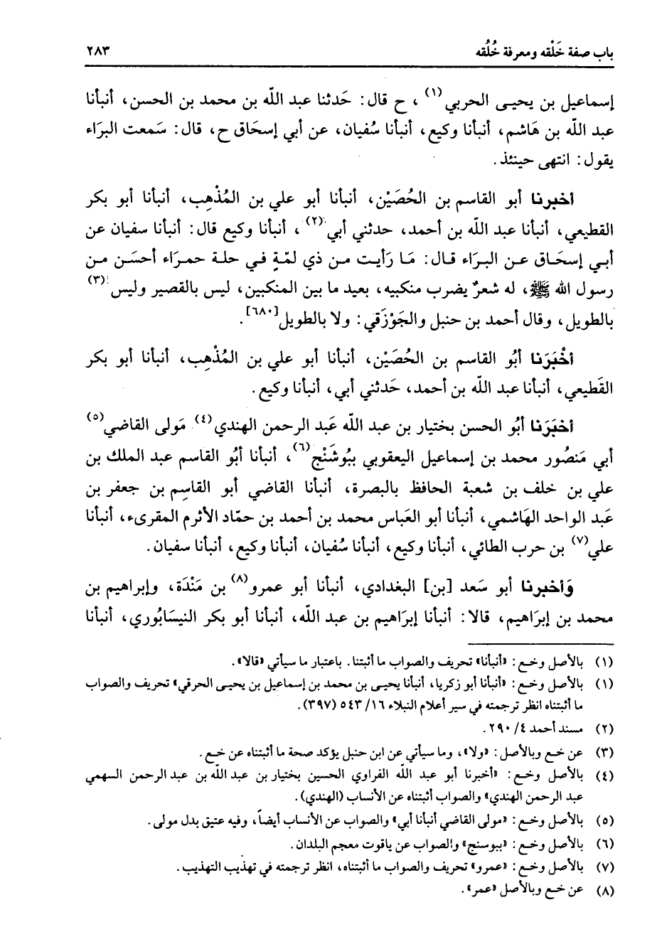 إسماعيل بن يحيى الحربي (1) ح قال حدثنا عبد الله بن محمد بن الحسن أنبأنا عبد الله بن هاشم أنبأنا وكيع أنبأنا سفيان عن أبي إسحاق ج قال سمعت البراء يقول انتهى حينئذ أخبرنا أبو القاسم بن الحصين أنبأنا أبو علي بن المذهب أنبأنا أبو بكر القطيعي أنبأنا عبد الله بن أحمد حدثني أبي (2) أنبأنا وكيع قال أنبأنا سفيان عن أبي إسحاق عن البراء قال ما رأيت من ذي لمة في حلة حمراء أحسن من رسول الله (صلى الله عليه وسلم) له شعر يضرب منكبيه بعيد ما بين المنكبين ليس بالقصير وليس (3) بالطويل وقال أحمد بن حنبل والجوزقي ولا بالطويل