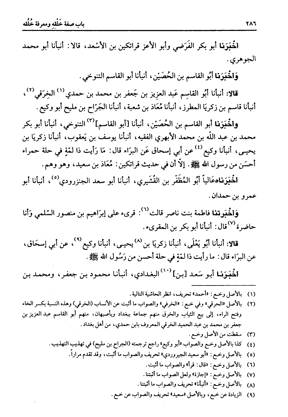 أخبرنا أبو بكر الفرضي وأبو الأعز قراتكين بن الأسعد قالا أنبأنا أبو محمد الجوهري وأخبرنا أبو القاسم بن الحصين أنبأنا أبو القاسم التنوخي قالا أنبأنا أبو القاسم عبد العزيز بن جعفر بن محمد بن حمدي (1) الخرقي (2) أنبأنا قاسم بن زكريا المطرز أنبأنا معاذ بن شعبة أنبأنا الجراح بن مليح أبو وكيع وأخبرنا أبو القاسم بن الحصين أنبأنا أبو القاسم (3) التنوخي أنبأنا أبو بكر محمد بن عبد الله بن محمد الأبهري الفقيه أنبأنا يوسف بن يعقوب أنبأنا زكريا بن يحيى أنبأنا وكيع (4) عن أبي إسحاق عن البراء قال ما رأيت ذا لمة في حلة حمراء أحسن من رسول الله (صلى الله عليه وسلم) إلا أن في حديث قراتكين معاذ بن سعيد وهو وهم أخبرناه عاليا أبو المظفر بن القشيري أنبأنا أبو سعد الجنزرودي (5) أنبأنا أبو عمرو بن حمدان وأخبرتنا فاطمة بنت ناصر قالت (6) قرئ على إبراهيم بن منصور السلمي وأنا حاضرة (7) قال أنبأنا أبو بكر بن المقرئ قالا أنبأنا أبو يعلى أنبأنا زكريا بن (8) يحيى أنبأنا وكيع (9) عن أبي إسحاق عن البراء قال ما رأيت ذا لمة في حلة أحسن من رسول الله (صلى الله عليه وسلم) أخبرنا أبو سعد بن (10) البغدادي أنبأنا محمود بن جعفر ومحمد بن