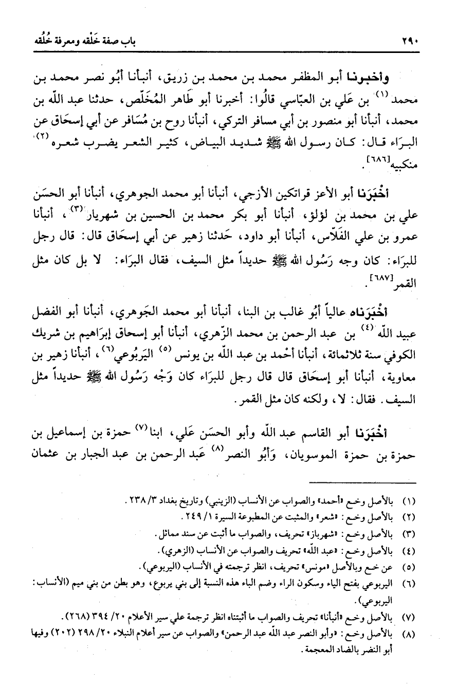 [686] أخبرنا أبو الأعز قراتكين الأزجي أنبأنا أبو محمد الجوهري أنبأنا أبو الحسن علي بن محمد بن لؤلؤ أنبأنا أبو بكر محمد بن الحسين بن شهريار (3) أنبأنا عمرو بن علي الفلاس أنبأنا أبو داود حدثنا زهير عن أبي إسحاق قال قال رجل للبراء كان وجه رسول الله (صلى الله عليه وسلم) حديدا مثل السيف فقال البراء لا بل كان مثل القمر أخبرناه عاليا أبو غالب بن البنا أنبأنا أبو محمد الجوهري أنبأنا أبو الفضل عبيد الله (4) بن عبد الرحمن بن محمد الزهري أنبأنا أبو إسحاق إبراهيم بن شريك الكوفي سنة ثلاثمائة أنبأنا أحمد بن عبد الله بن يونس (5) اليربوعي (6) أنبأنا زهير بن معاوية أنبأنا أبو إسحاق قال قال رجل للبراء كان وجه رسول الله (صلى الله عليه وسلم) حديدا مثل السيف فقال لا ولكنه كان مثل القمر أخبرنا أبو القاسم عبد الله وأبو الحسن علي (7) ابنا حمزة بن إسماعيل بن حمزة بن حمزة الموسويان وأبو النصر (8) عبد الرحمن بن عبد الجبار بن عثمان