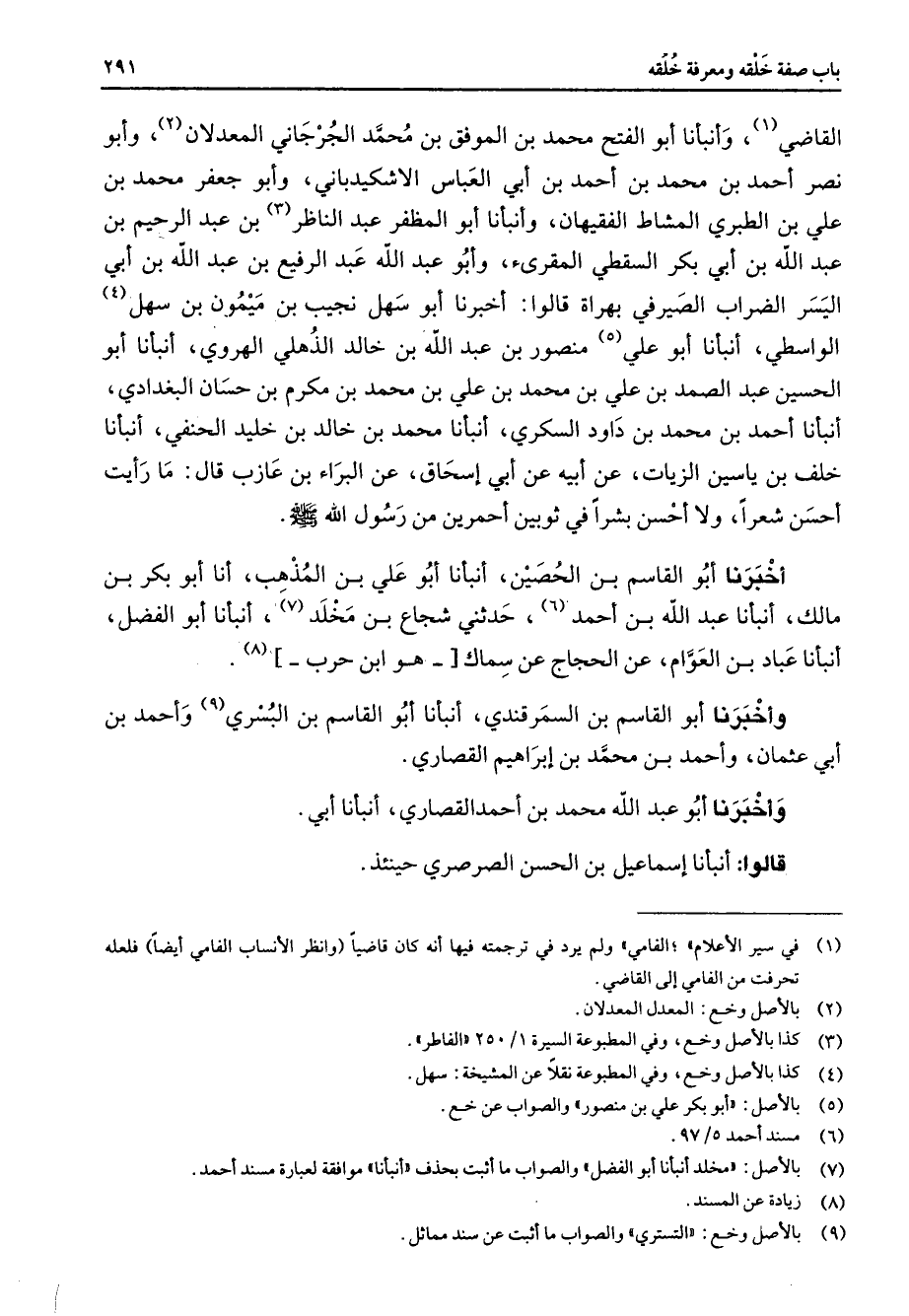 القاضي (1) وأنبأنا أبو الفتح محمد بن الموفق بن محمد الجرجاني المعدلان (2) وأبو نصر أحمد بن محمد بن أحمد بن أبي العباس الاشكيدباني وأبو جعفر محمد بن علي بن الطبري المشاط الفقيهان وأنبأنا أبو المظفر عبد الناظر (3) بن عبد الرحيم بن عبد الله بن أبي بكر السقطي المقرئ وأبو عبد الله عبد الرفيع بن عبد الله بن أبي اليسر الضراب الصيرفي بهراة قالوا أخبرنا أبو سهل نجيب بن ميمون بن سهل (4) الواسطي أنبأنا أبو علي (5) منصور بن عبد الله بن خالد الذهلي الهروي أنبأنا أبو الحسين عبد الصمد بن علي بن محمد بن علي بن محمد بن مكرم بن حسان البغدادي أنبأنا أحمد بن محمد بن داود السكري أنبأنا محمد بن خالد بن خليد الحنفي أنبأنا خلف بن ياسين الزيات عن أبيه عن أبي إسحاق عن البراء بن عازب قال ما رأيت أحسن شعرا ولا أحسن بشرا في ثوبين أحمرين من رسول الله (صلى الله عليه وسلم) أخبرنا أبو القاسم بن الحصين أنبأنا أبو علي بن المذهب أنا أبو بكر بن مالك أنبأنا عبد الله بن أحمد (6) حدثني شجاع بن مخلد (7) أنبأنا أبو الفضل أنبأنا عباد بن العوام عن الحجاج عن سماك هو ابن حرب (8) وأخبرنا أبو القاسم بن السمرقندي أنبأنا أبو القاسم بن البسري (9) وأحمد بن أبي عثمان وأحمد بن محمد بن إبراهيم القصاري وأخبرنا أبو عبد الله محمد بن أحمد القصاري أنبأنا أبي قالوا أنبأنا إسماعيل بن الحسن الصرصري حينئذ