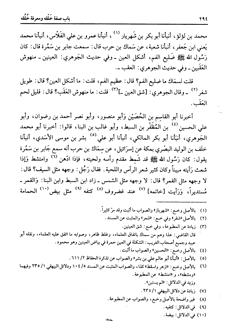 محمد بن لؤلؤ أنبأنا أبو بكر بن شهريار (1) أنبأنا عمرو بن علي الفلاس أنبأنا محمد يعني ابن جعفر أنبأنا شعبة عن سماك بن حرب قال سمعت جابر بن سمرة قال كان رسول الله (صلى الله عليه وسلم) ضليع الفم أشكل العين وفي حديث الجوهري العينين منهوش العقبين وفي حديث الجوهري العقب قلت لسماك ما ضليع الفم قال عظيم الفم قلت ما أشكل العين قال طويل شفر (2) وقال الجوهري شق العين (3) قلت ما منهوش العقب قال قليل لحم العقب أخبرنا أبو القاسم بن الحصين وأبو منصور وأبو نصر أحمد بن رضوان وأبو علي الحسين (4) بن المظفر بن السبط وأبو غالب بن البنا قالوا أخبرنا أبو محمد الجوهري أنبأنا أبو بكر المالكي أنبأنا أبو علي (5) بشر بن موسى الأسدي أنبأنا خلف بن الوليد البصري بمكة عن إسرائيل عن سماك بن حرب أنه سمع جابر بن سمرة يقول كان رسول الله (صلى الله عليه وسلم) قد شمط مقدم رأسه ولحيته فإذا أدهن (6) وامتشط وإذا شعث رأيته مبينا وكان كثير شعر الرأس واللحية فقال رجل وجهه مثل السيف قال لا وجهه مثل القمر قال لا وجهه مثل الشمس زاد ابن السبط وابن البنا والقمر مستديرا ورأيت خاتمه (7) عند غضروف (8) كتفه (9) مثل بيض (10) الحمامة
