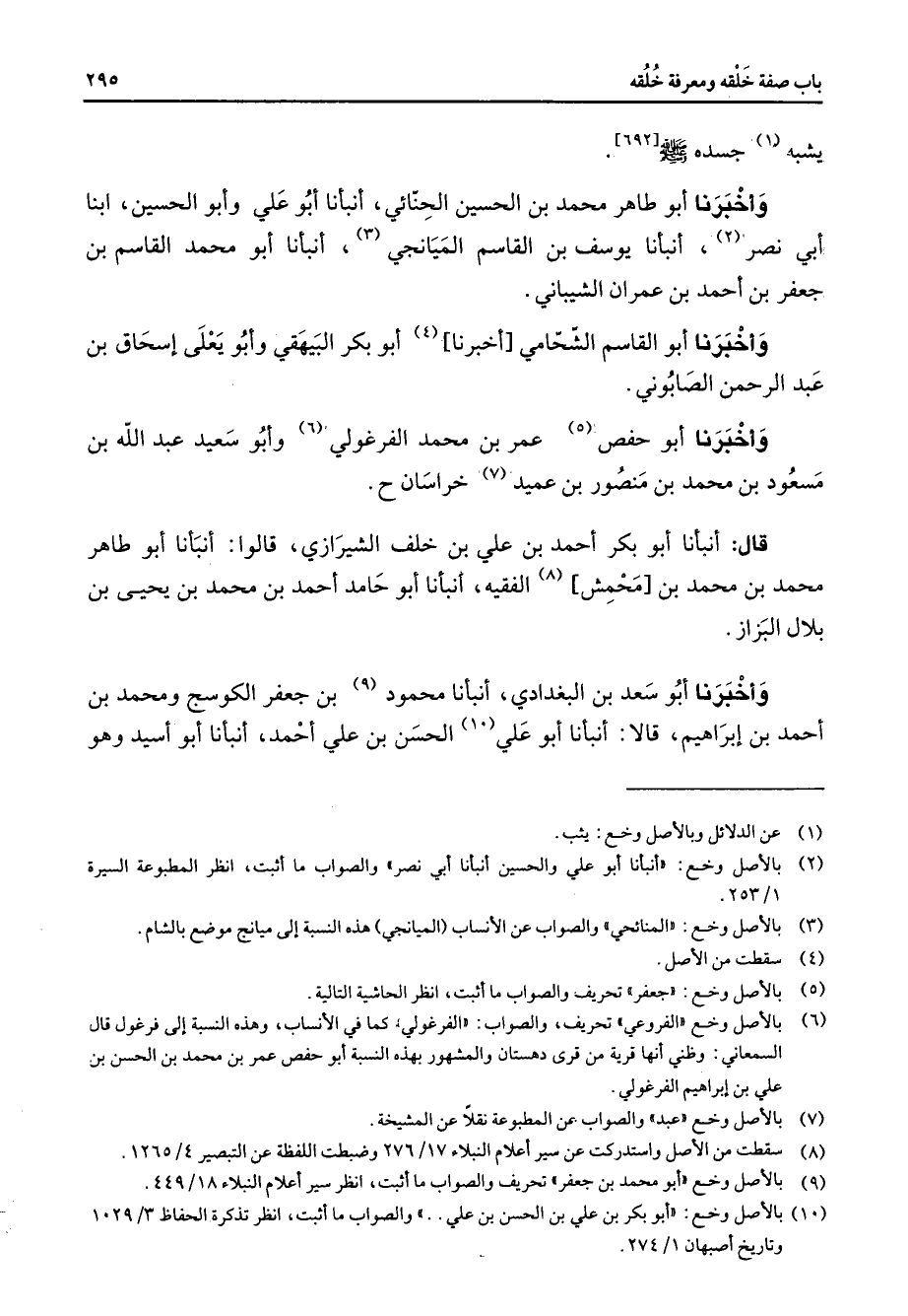 [692] وأخبرنا أبو طاهر محمد بن الحسين الحنائي أنبأنا أبو علي وأبو الحسين ابنا أبي نصر (2) أنبأنا يوسف بن القاسم الميانجي (3) أنبأنا أبو محمد القاسم بن جعفر بن أحمد بن عمران الشيباني وأخبرنا أبو القاسم الشحامي أخبرنا (4) أبو بكر البيهقي وأبو يعلى إسحاق بن عبد الرحمن الصابوني وأخبرنا أبو حفص (5) عمر بن محمد الفرغولي (6) وأبو سعيد عبد الله بن مسعود بن محمد بن منصور بن عميد (7) خراسان قال أنبأنا أبو بكر أحمد بن علي بن خلف الشيرازي قالوا أنبأنا أبو طاهر محمد بن محمد بن محمش (8) الفقيه أنبأنا أبو حامد أحمد بن محمد بن يحيى بن بلال البزاز وأخبرنا أبو سعد بن البغدادي أنبأنا محمود (9) بن جعفر الكوسج ومحمد بن أحمد بن إبراهيم قالا أنبأنا أبو علي (10) الحسن بن علي أحمد أنبأنا أبو أسيد وهو