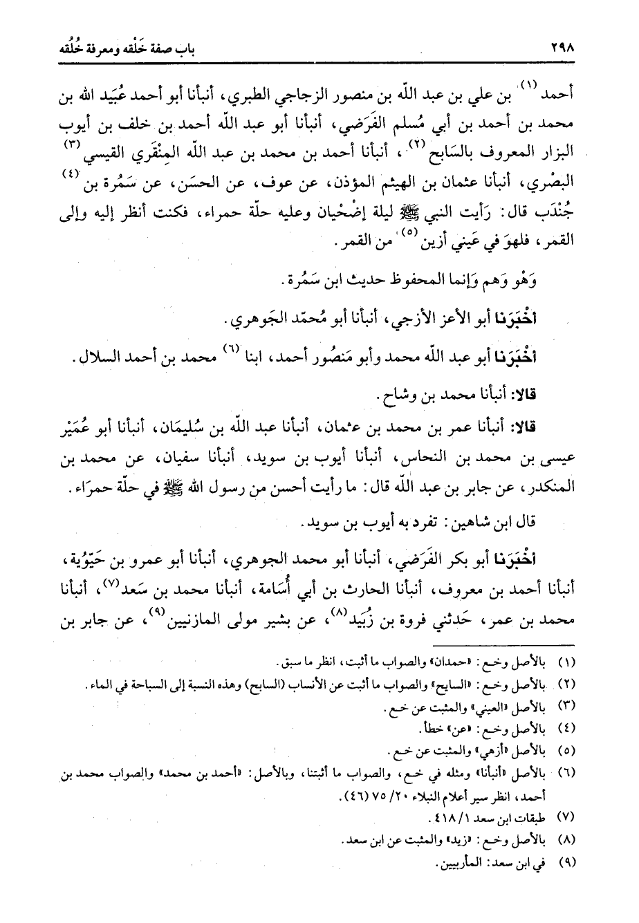 أحمد (1) بن علي بن عبد الله بن منصور الزجاجي الطبري أنبأنا أبو أحمد عبيد الله بن محمد بن أحمد بن أبي مسلم الفرضي أنبأنا أبو عبد الله أحمد بن خلف بن أيوب البزار المعروف بالسابح (2) أنبأنا أحمد بن محمد بن عبد الله المنقري القيسي (3) البصري أنبأنا عثمان بن الهيثم المؤذن عن عوف عن الحسن عن سمرة بن (4) جندب قال رأيت النبي (صلى الله عليه وسلم) ليلة إضحيان وعليه حلة حمراء فكنت أنظر إليه وإلى القمر فلهو في عيني أزين (5) من القمر وهو وهم وإنما المحفوظ حديث ابن سمرة أخبرنا أبو الأعز الأزجي أنبأنا أبو محمد الجوهري أخبرنا أبو عبد الله محمد وأبو منصور أحمد ابنا (6) محمد بن أحمد السلال قالا أنبأنا محمد بن وشاح قالا أنبأنا عمر بن محمد بن عثمان أنبأنا عبد الله بن سليمان أنبأنا أبو عمير عيسى بن محمد بن النحاس أنبأنا أيوب بن سويد أنبأنا سفيان عن محمد بن المنكدر عن جابر بن عبد الله قال ما رأيت أحسن من رسول الله (صلى الله عليه وسلم) في حلة حمراء قال ابن شاهين تفرد به أيوب بن سويد أخبرنا أبو بكر الفرضي أنبأنا أبو محمد الجوهري أنبأنا أبو عمرو بن حيوية أنبأنا أحمد بن معروف أنبأنا الحارث بن أبي أسامة أنبأنا محمد بن سعد (7) أنبأنا محمد بن عمر حدثني فروة بن زبيد (8) عن بشير مولى المازنيين (9) عن جابر بن