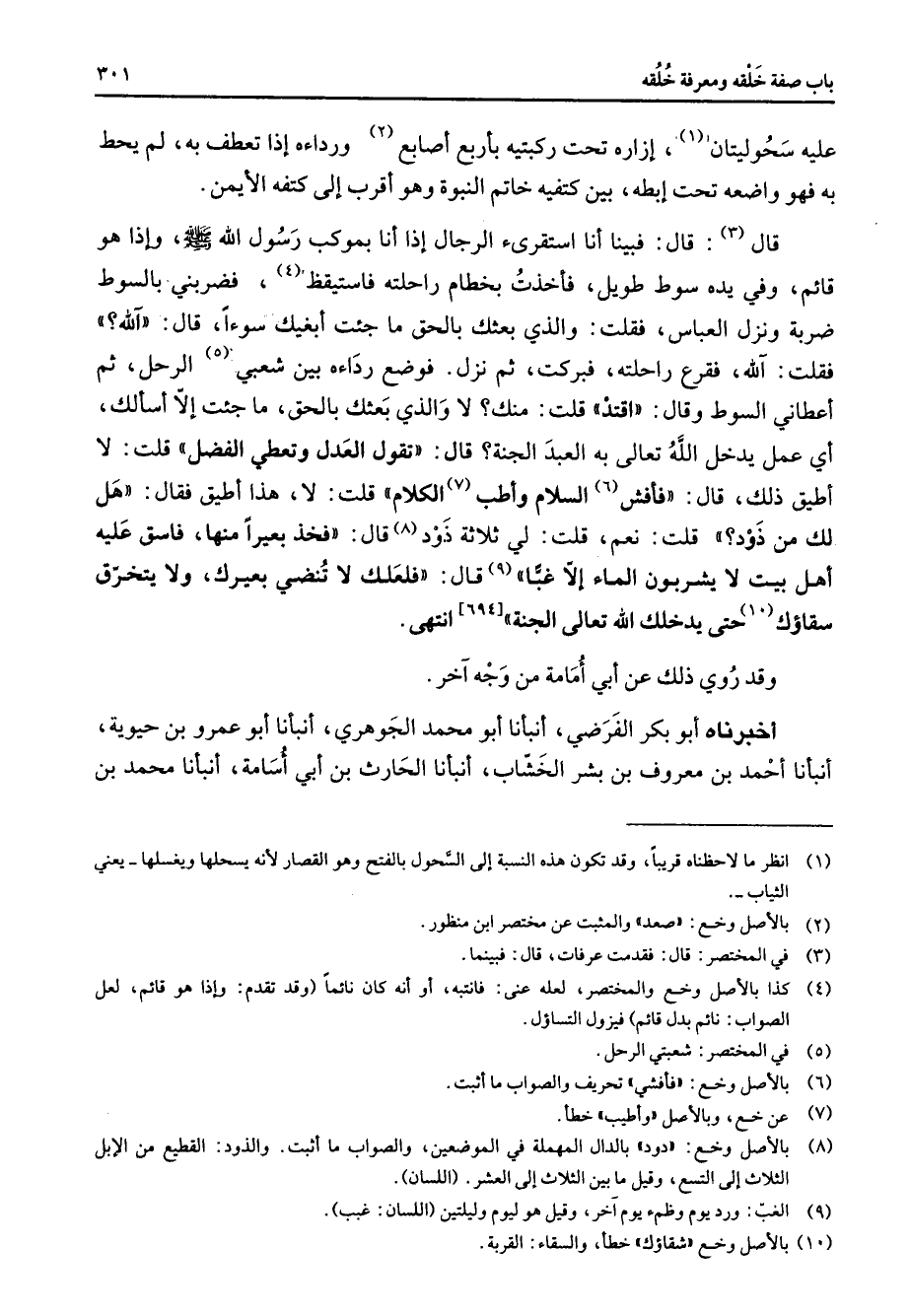 عليه سحوليتان (1) إزاره تحت ركبتيه بأربع أصابع (2) ورداءه إذا تعطف به لم يحط به فهو واضعه تحت إبطه بين كتفيه خاتم النبوة وهو أقرب إلى كتفه الأيمن قال (3) قال فبينا أنا أستقرئ الرجال إذا أنا بموكب رسول الله (صلى الله عليه وسلم) وإذا هو قائم وفي يده سوط طويل فأخذت بخطام راحلته فاستيقظ (4) فضربني بالسوط ضربة ونزل العباس فقلت والذي بعثك بالحق ما جئت أبغيك سوءا قال آلله فقلت آلله فقرع راحلته فبركت ثم نزل فوضع رداءه بين شعبي (5) الرحل ثم أعطاني السوط وقال اقتد قلت منك لا والذي بعثك بالحق ما جئت إلا أسألك أي عمل يدخل الله تعالى به العبد الجنة قال تقول العدل وتعطي الفضل قلت لا أطيق ذلك قال فأفش (6) السلام وأطب (7) الكلام قلت لا هذا أطيق فقال هل لك من ذود قلت نعم قلت لي ثلاثة ذود (8) قال فخذ بعيرا منها فاسق عليه أهل بيت لا يشربون الماء إلا غبا (9) قال فلعلك لا تنضي بعيرك ولا يتخرق سقاؤك (10) حتى يدخلك الله تعالى الجنة