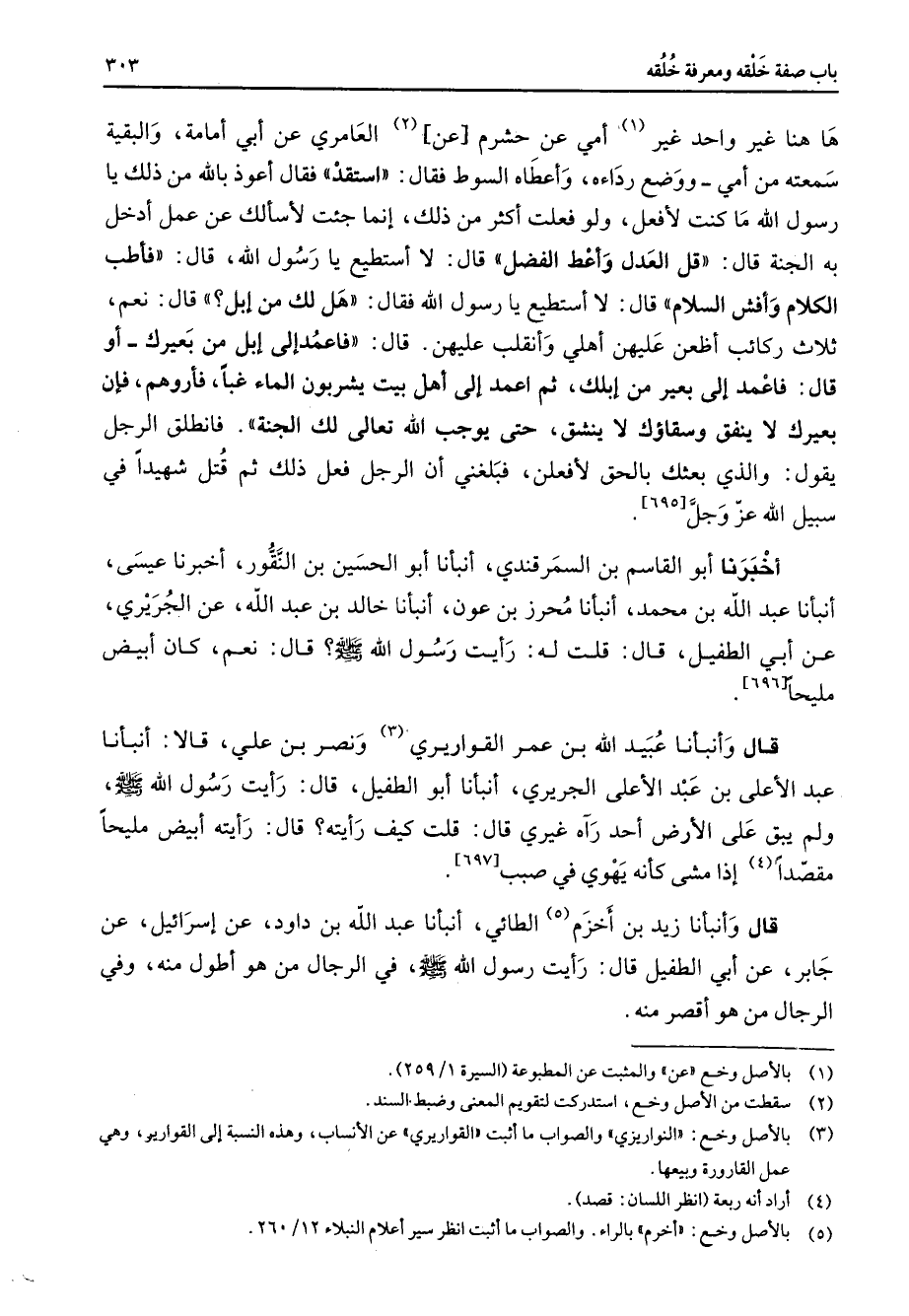 [695] أخبرنا أبو القاسم بن السمرقندي أنبأنا أبو الحسين بن النقور أخبرنا عيسى أنبأنا عبد الله بن محمد أنبأنا محرز بن عون أنبأنا خالد بن عبد الله عن الجريري عن أبي الطفيل قال قلت له رأيت رسول الله (صلى الله عليه وسلم) قال نعم كان أبيض مليحا قال وأنبأنا عبيد الله بن عمر القواريري (3) ونصر بن علي قالا أنبأنا عبد الأعلى بن عبد الأعلى الجريري أنبأنا أبو الطفيل قال رأيت رسول الله (صلى الله عليه وسلم) ولم يبق على الأرض أحد رآه غيري قال قلت كيف رأيته قال رأيته أبيض مليحا مقصدا (4) إذا مشى كأنه يهوي في صبب